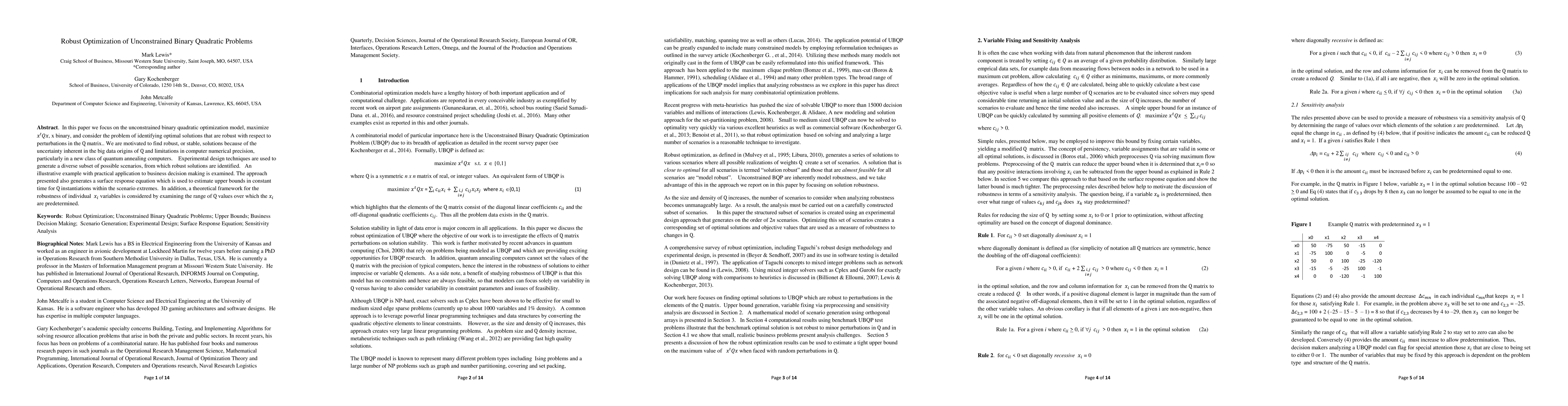 In this paper we focus on the unconstrained binary quadratic optimization model, maximize x^t Qx, x binary, and consider the problem of identifying optimal solutions that are robust with respect to perturbations in the Q matrix.. We are motivated to find robust, or stable, solutions because of the uncertainty inherent in the big data origins of Q and limitations in computer numerical precision, particularly in a new class of quantum annealing computers. Experimental design techniques are used to generate a diverse subset of possible scenarios, from which robust solutions are identified. An illustrative example with practical application to business decision making is examined. The approach presented also generates a surface response equation which is used to estimate upper bounds in constant time for Q instantiations within the scenario extremes. In addition, a theoretical framework for the robustness of individual x_i variables is considered by examining the range of Q values over which the x_i are predetermined.