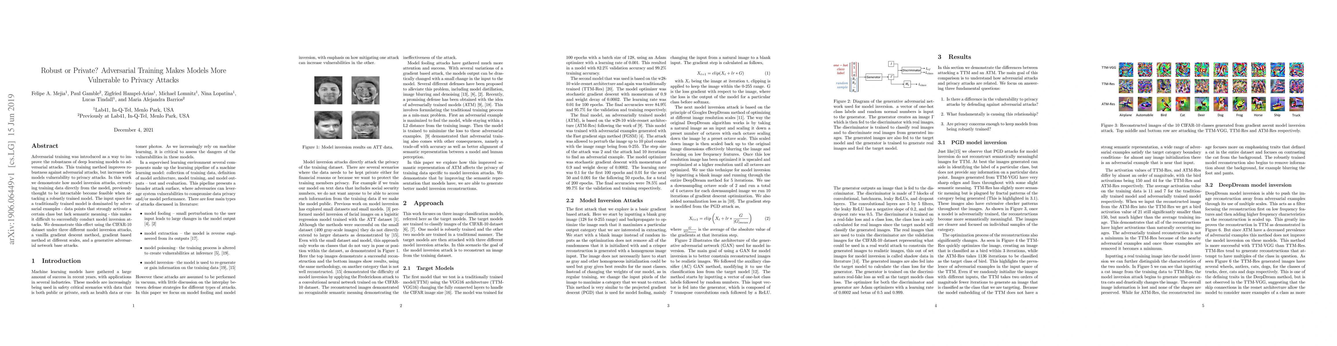 This paper shows that adversarial training, which enhances model robustness against adversarial attacks, paradoxically makes models more susceptible to privacy attacks. It demonstrates that model inversion attacks, which extract training data from the model, become feasible against robustly trained models, using CIFAR-10 dataset and various attack methods.