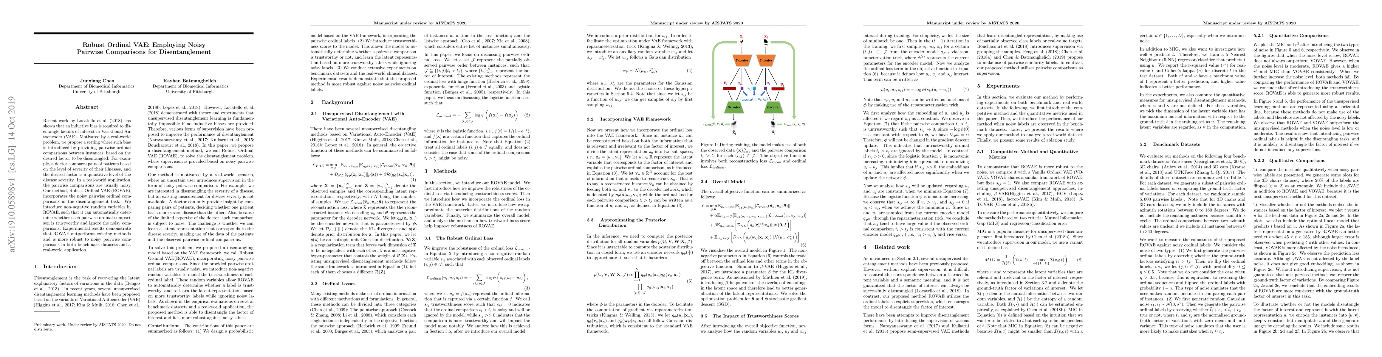 The paper proposes Robust Ordinal VAE (ROVAE) to disentangle factors using noisy pairwise comparisons, introducing non-negative random variables to determine the trustworthiness of comparisons. ROVAE outperforms existing methods and shows robustness to noisy data in both synthetic and real-world applications.