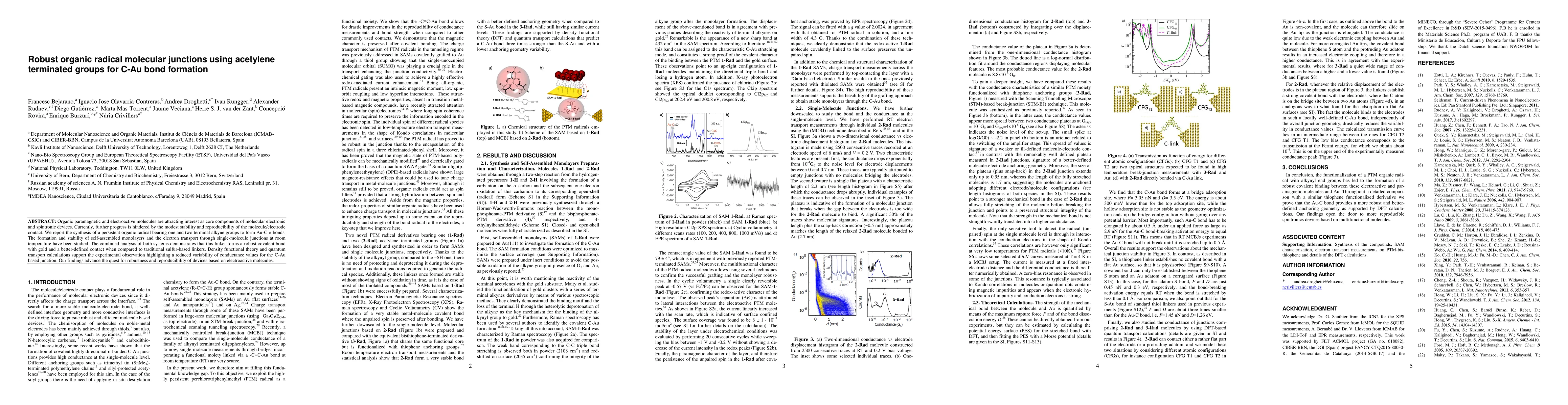 Organic paramagnetic and electroactive molecules are attracting interest as core components of molecular electronic and spintronic devices. Currently, further progress is hindered by the modest stability and reproducibility of the molecule/electrode contact. We report the synthesis of a persistent organic radical bearing one and two terminal alkyne groups to form Au-C {\sigma} bonds. The formation and stability of self-assembled monolayers and the electron transport through single-molecule junctions at room temperature have been studied. The combined analysis of both systems demonstrates that this linker forms a robust covalent bond with gold and a better-defined contact when compared to traditional sulfur-based linkers. Density functional theory and quantum transport calculations support the experimental observation highlighting a reduced variability of conductance values for the C-Au based junction. Our findings advance the quest for robustness and reproducibility of devices based on electroactive molecules.