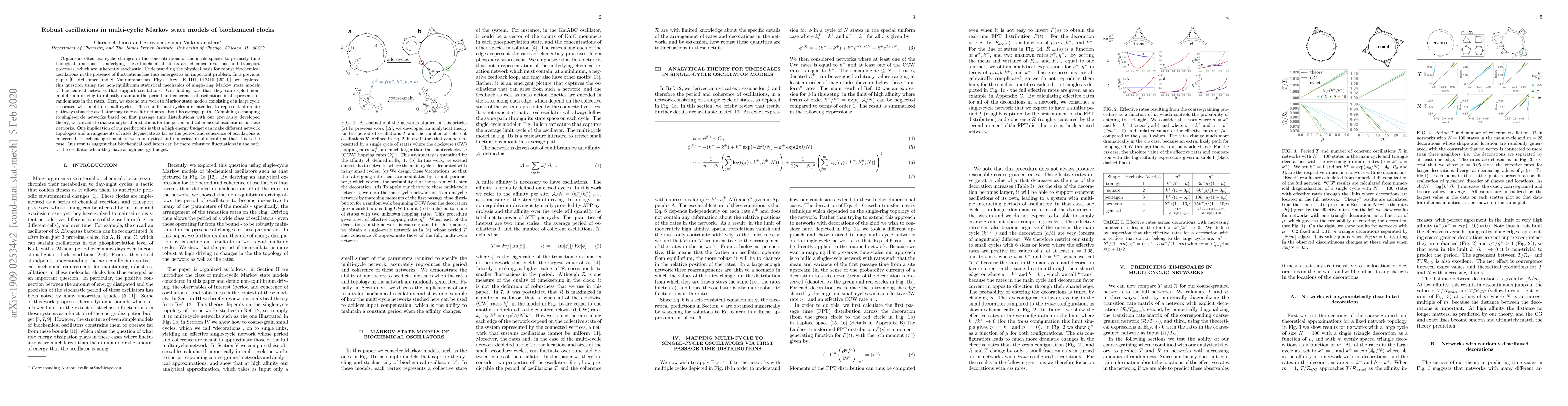This paper explores robust biochemical oscillations in multi-cyclic Markov state models, showing that high energy budgets can make different network topologies degenerate in terms of oscillation period and coherence. Analytical predictions align well with numerical results, indicating biochemical oscillators' enhanced robustness against fluctuations.