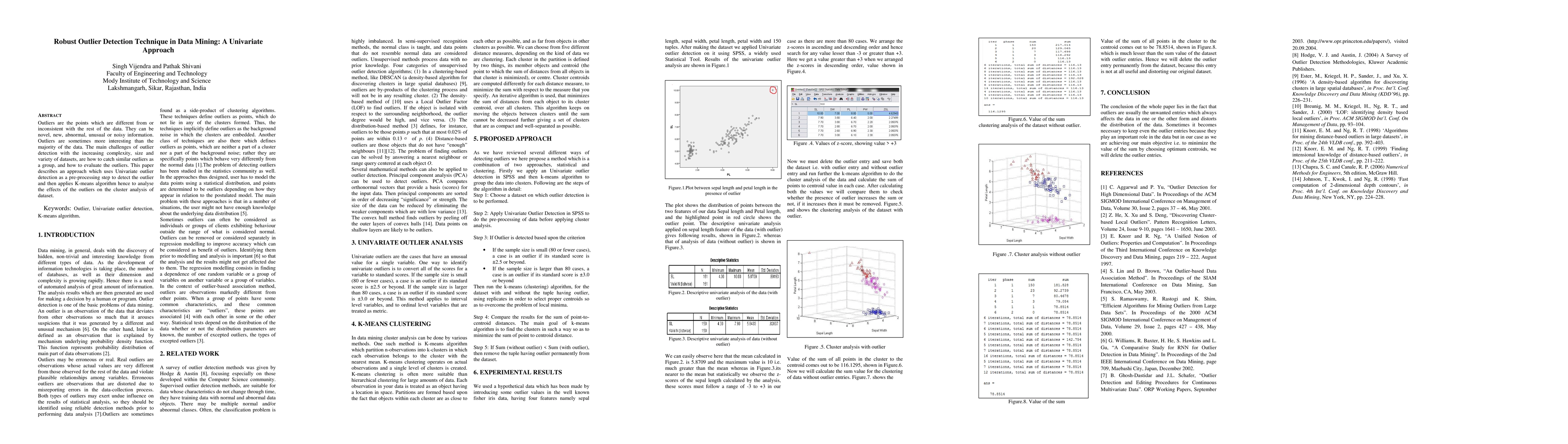 Outliers are the points which are different from or inconsistent with the rest of the data. They can be novel, new, abnormal, unusual or noisy information. Outliers are sometimes more interesting than the majority of the data. The main challenges of outlier detection with the increasing complexity, size and variety of datasets, are how to catch similar outliers as a group, and how to evaluate the outliers. This paper describes an approach which uses Univariate outlier detection as a pre-processing step to detect the outlier and then applies K-means algorithm hence to analyse the effects of the outliers on the cluster analysis of dataset.