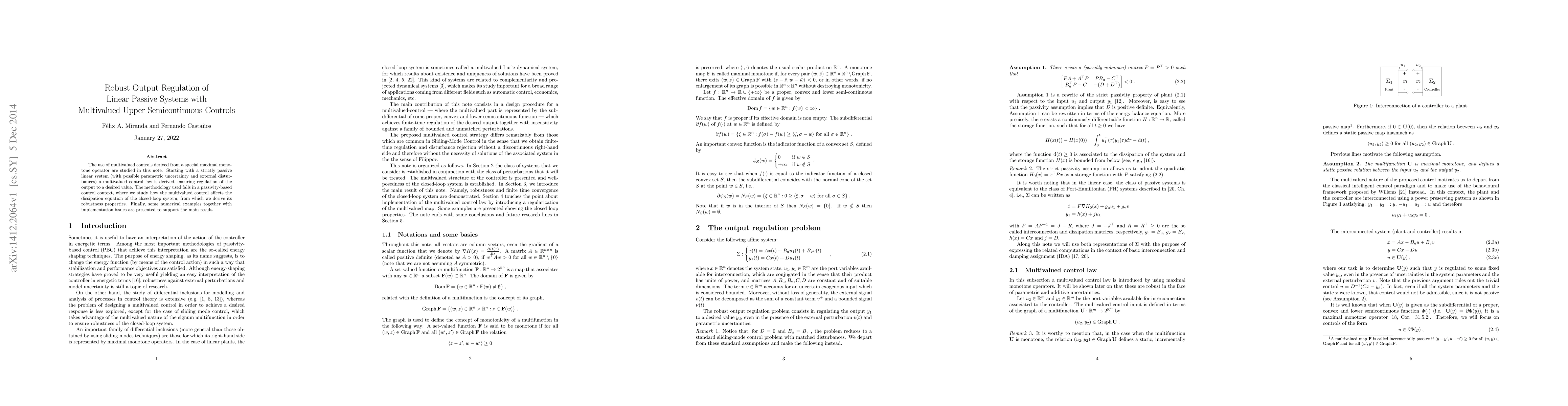 This research derives a multivalued control law for strictly passive linear systems with uncertainties and disturbances, ensuring output regulation via a passivity-based approach. It examines the impact of multivalued controls on system dissipation and presents numerical examples with implementation insights.
