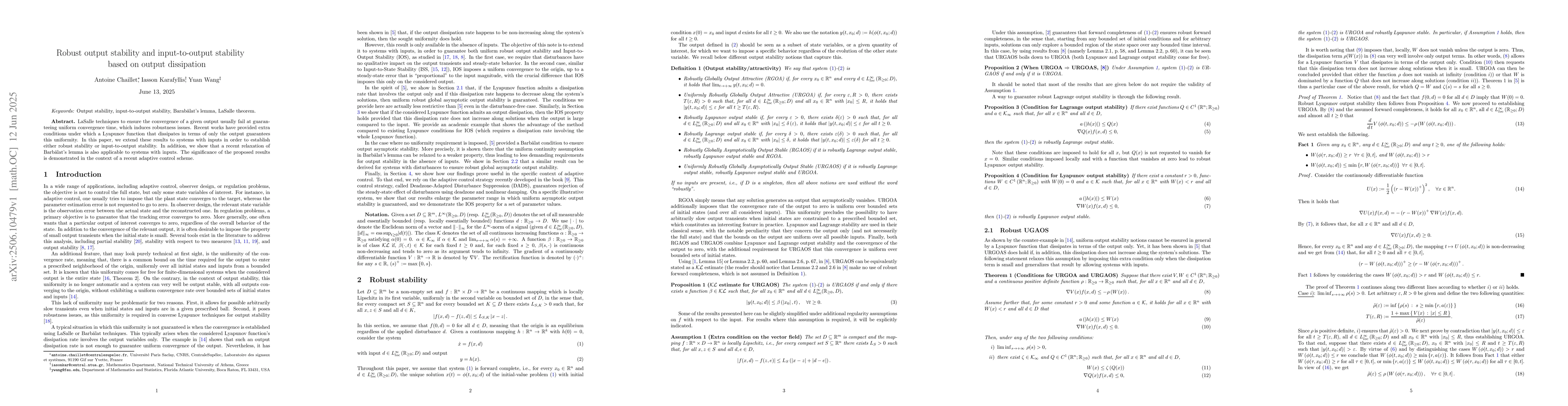 This research extends techniques for ensuring output stability in control systems to include inputs, improving robustness and uniform convergence guarantees. It also applies a recent mathematical relaxation to systems with inputs, demonstrating its usefulness in adaptive control scenarios.