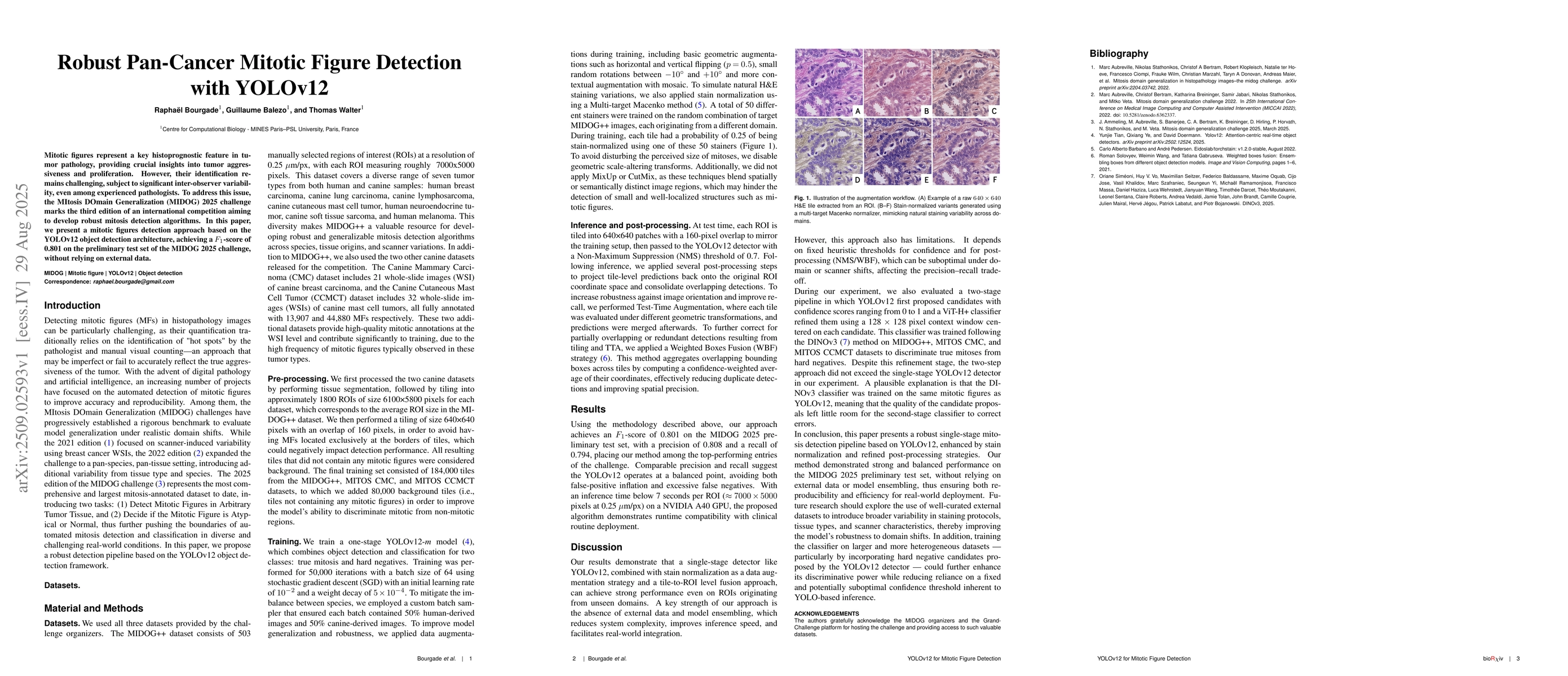 Mitotic figures represent a key histoprognostic feature in tumor pathology, providing crucial insights into tumor aggressiveness and proliferation. However, their identification remains challenging, subject to significant inter-observer variability, even among experienced pathologists. To address this issue, the MItosis DOmain Generalization (MIDOG) 2025 challenge marks the third edition of an international competition aiming to develop robust mitosis detection algorithms. In this paper, we present a mitotic figures detection approach based on the YOLOv12 object detection architecture, achieving a $F_1$-score of 0.801 on the preliminary test set of the MIDOG 2025 challenge, without relying on external data.