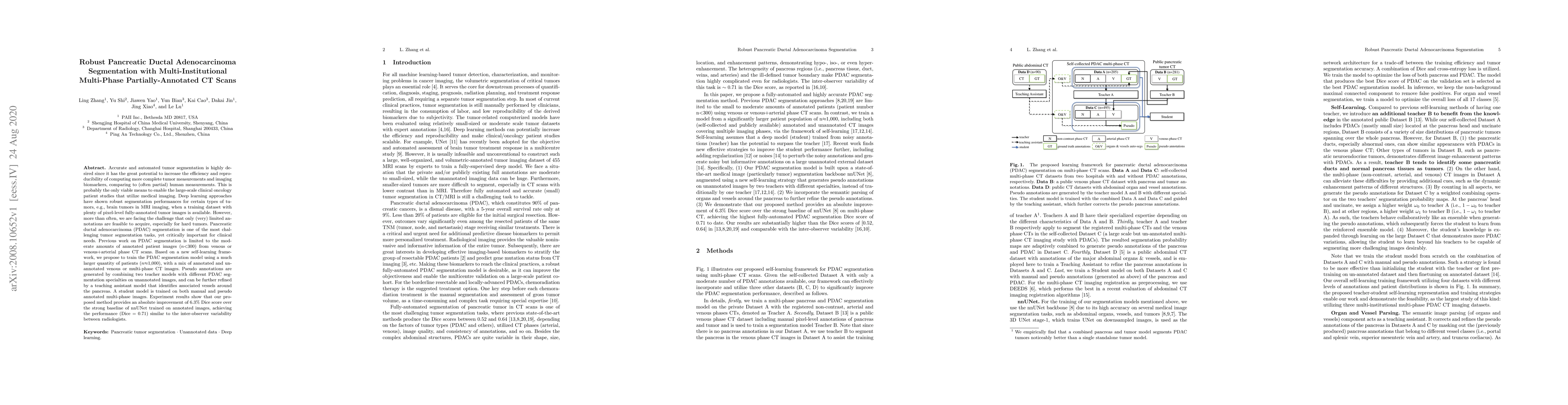 This paper proposes a self-learning framework for robust pancreatic ductal adenocarcinoma (PDAC) segmentation using multi-institutional, multi-phase CT scans with limited annotations. The method generates pseudo annotations from two teacher models and refines them with a teaching assistant, achieving a 6.3% Dice score improvement over the baseline.