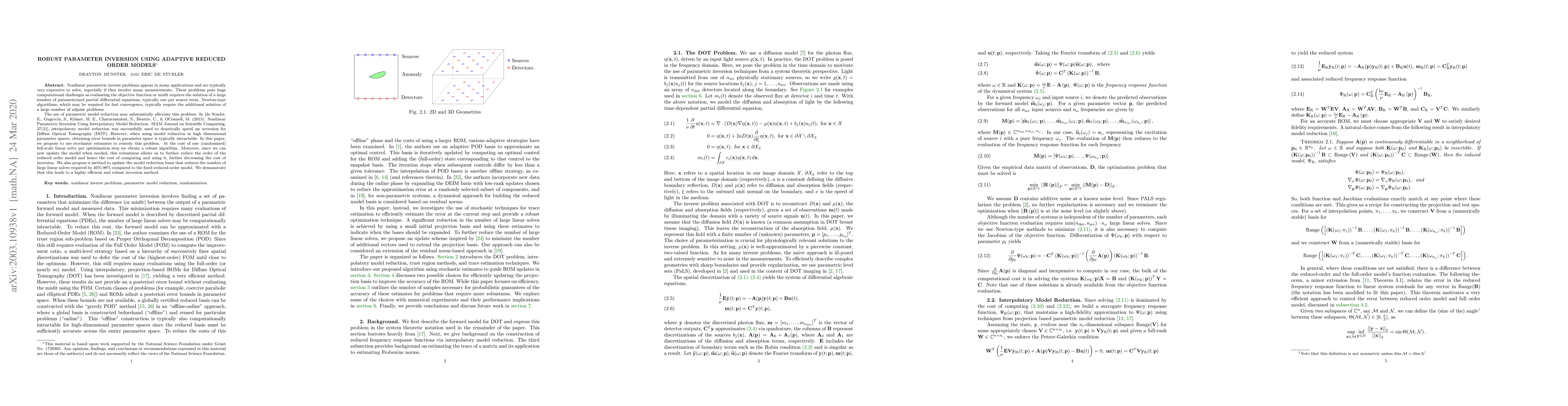 Nonlinear parametric inverse problems appear in many applications and are typically very expensive to solve, especially if they involve many measurements. These problems pose huge computational challenges as evaluating the objective function or misfit requires the solution of a large number of parameterized partial differential equations, typically one per source term. Newton-type algorithms, which may be required for fast convergence, typically require the additional solution of a large number of adjoint problems. The use of parametric model reduction may substantially alleviate this problem. In [de Sturler, E., Gugercin, S., Kilmer, M. E., Chaturantabut, S., Beattie, C., and O'Connell, M. (2015). Nonlinear Parametric Inversion Using Interpolatory Model Reduction. SIAM Journal on Scientific Computing, 37(3)], interpolatory model reduction was successfully used to drastically speed up inversion for Diffuse Optical Tomography (DOT). However, when using model reduction in high dimensional parameter spaces, obtaining error bounds in parameter space is typically intractable. In this paper, we propose to use stochastic estimates to remedy this problem. At the cost of one (randomized) full-scale linear solve per optimization step we obtain a robust algorithm. Moreover, since we can now update the model when needed, this robustness allows us to further reduce the order of the reduced order model and hence the cost of computing and using it, further decreasing the cost of inversion. We also propose a method to update the model reduction basis that reduces the number of large linear solves required by 46%-98% compared with the fixed reduced-order model. We demonstrate that this leads to a highly efficient and robust inversion method.