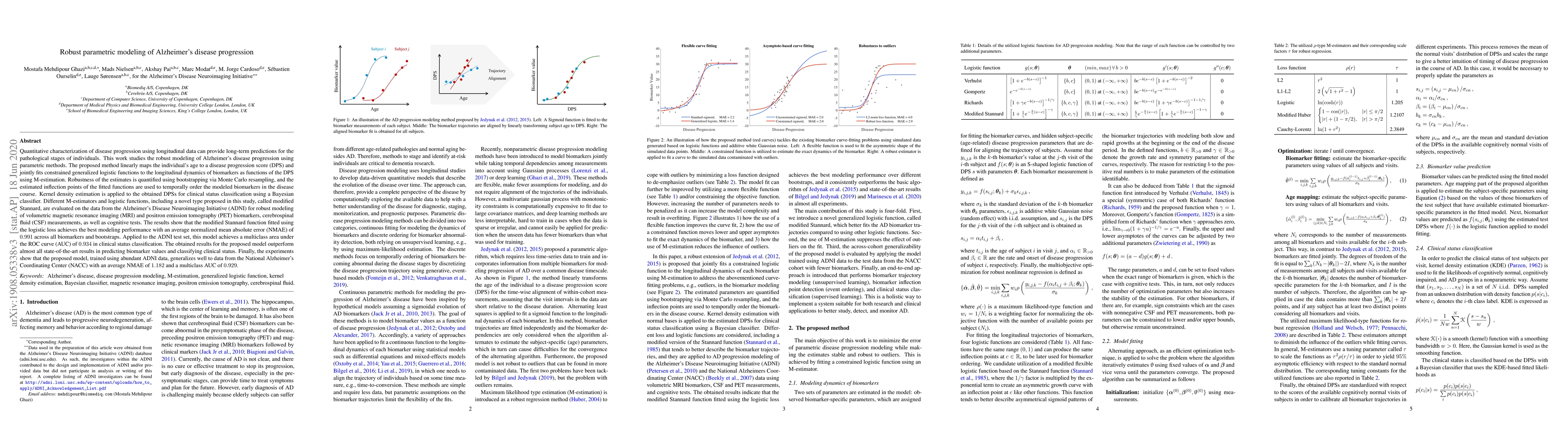 This paper proposes a robust parametric model for Alzheimer's disease progression using logistic functions and M-estimation to fit biomarkers longitudinally. The modified Stannard logistic function, evaluated against ADNI data, achieves superior performance in predicting biomarker values and classifying clinical status compared to existing methods.