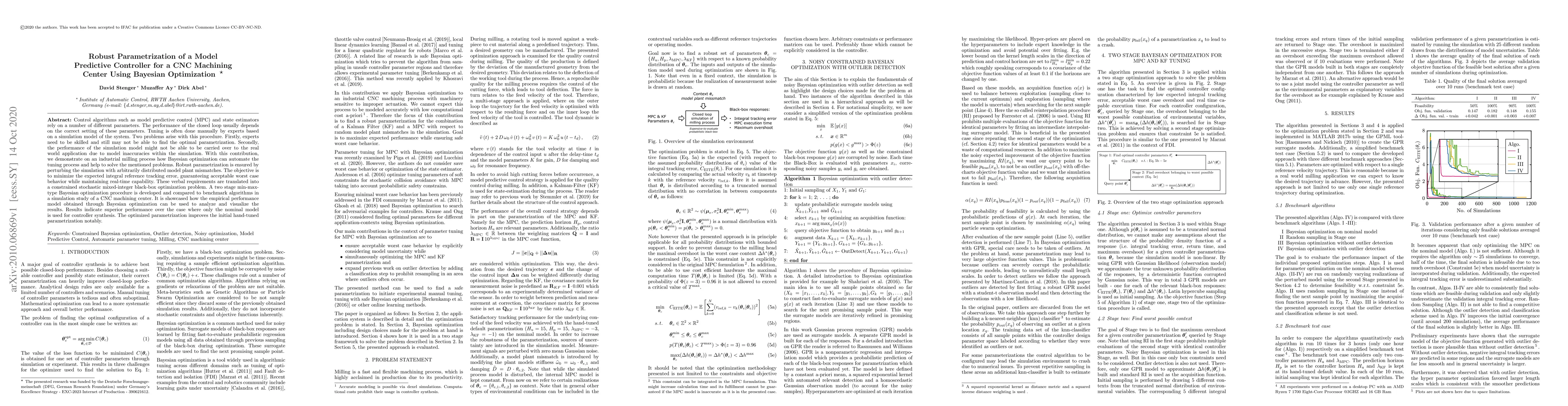 Control algorithms such as model predictive control (MPC) and state estimators rely on a number of different parameters. The performance of the closed loop usually depends on the correct setting of these parameters. Tuning is often done manually by experts based on a simulation model of the system. Two problems arise with this procedure. Firstly, experts need to be skilled and still may not be able to find the optimal parametrization. Secondly, the performance of the simulation model might not be able to be carried over to the real world application due to model inaccuracies within the simulation. With this contribution, we demonstrate on an industrial milling process how Bayesian optimization can automate the tuning process and help to solve the mentioned problems. Robust parametrization is ensured by perturbing the simulation with arbitrarily distributed model plant mismatches. The objective is to minimize the expected integral reference tracking error, guaranteeing acceptable worst case behavior while maintaining real-time capability. These verbal requirements are translated into a constrained stochastic mixed-integer black-box optimization problem. A two stage min-max-type Bayesian optimization procedure is developed and compared to benchmark algorithms in a simulation study of a CNC machining center. It is showcased how the empirical performance model obtained through Bayesian optimization can be used to analyze and visualize the results. Results indicate superior performance over the case where only the nominal model is used for controller synthesis. The optimized parametrization improves the initial hand-tuned parametrization notably.