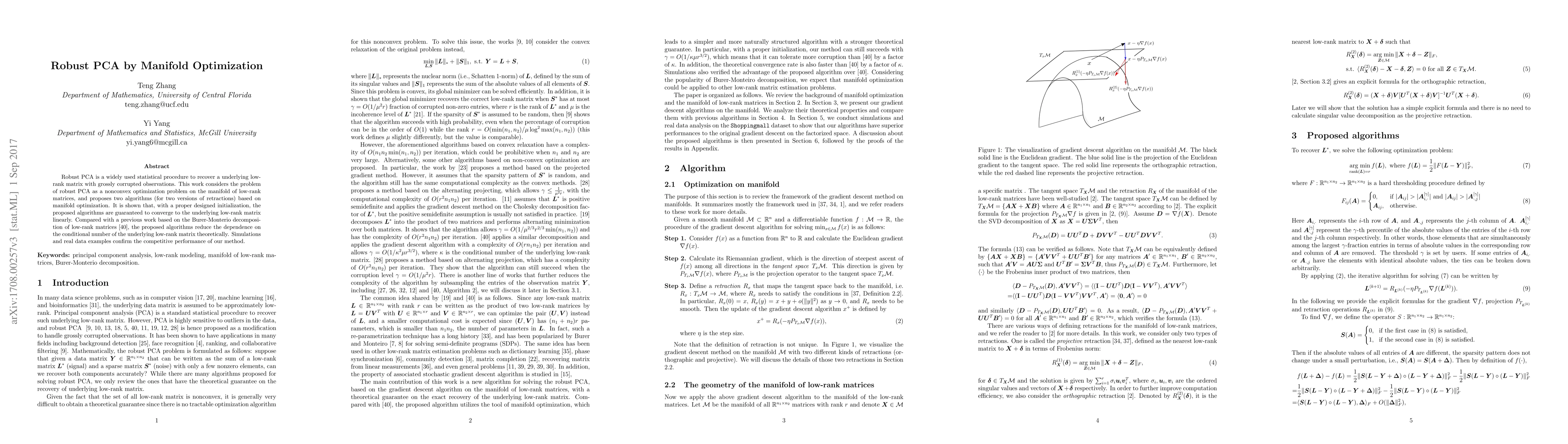 This paper proposes two manifold optimization algorithms for robust PCA, showing linear convergence with proper initialization. The new methods reduce dependence on the matrix's condition number compared to previous approaches, and demonstrate competitive performance in simulations and real-world data.