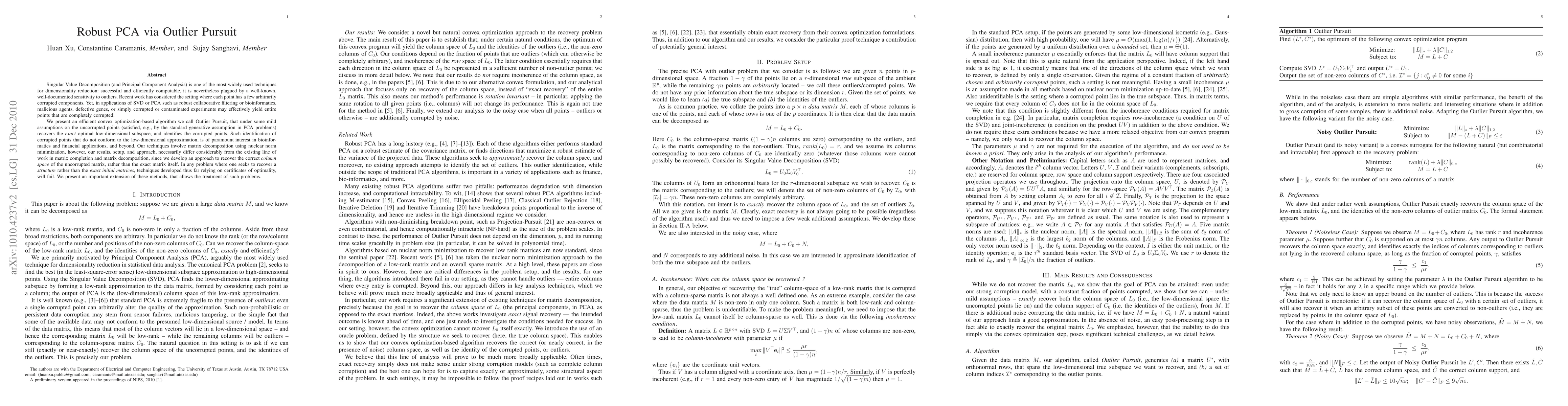 This paper introduces Outlier Pursuit, a convex optimization algorithm for Robust PCA that identifies and separates corrupted data points from uncorrupted data, enabling accurate low-dimensional subspace recovery. Unlike existing matrix decomposition methods, Outlier Pursuit focuses on recovering the correct column space of the uncorrupted matrix, making it particularly useful for applications in bioinformatics and finance.