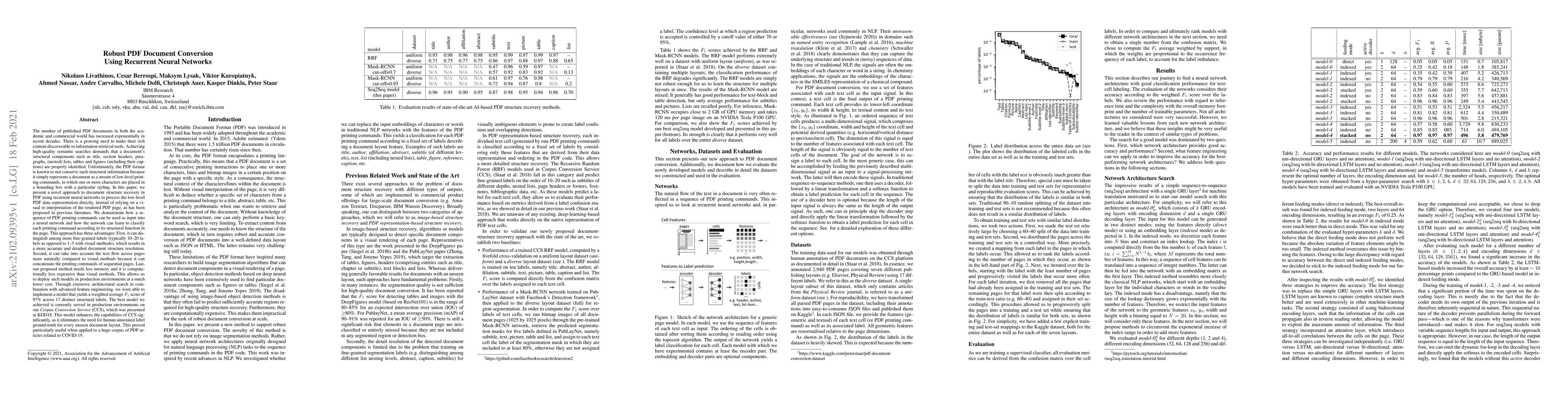 This paper proposes a recurrent neural network approach for converting PDF documents into structured formats by processing low-level PDF printing commands directly, achieving a 97% F1 score. This method offers more detailed structure recovery, better text flow across pages, and lower computational costs compared to visual re-interpretation methods.