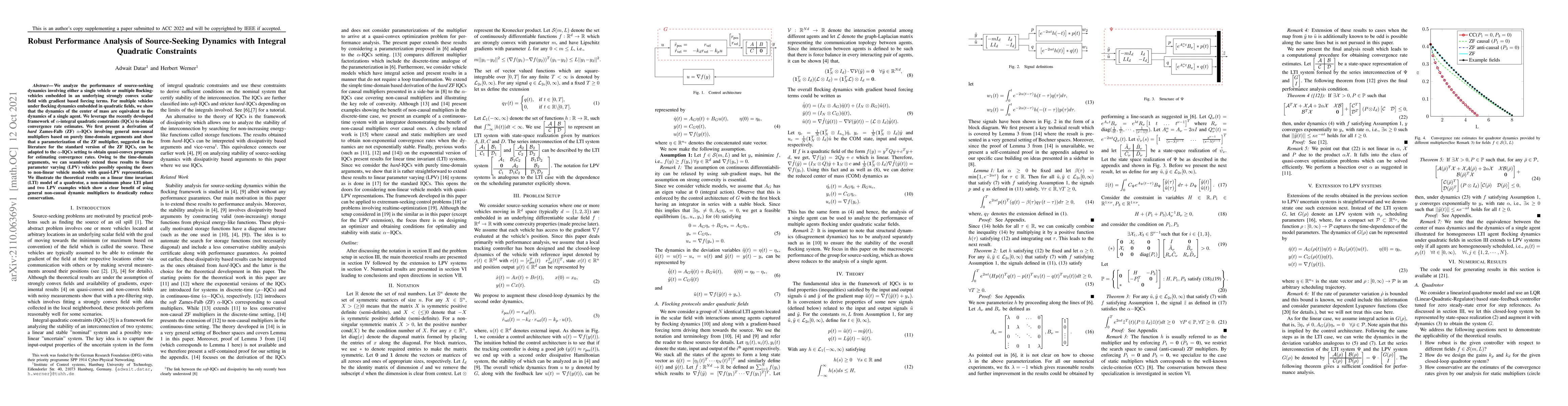 This paper analyzes the source-seeking dynamics of single or multiple vehicles in a strongly convex scalar field, showing that the center of mass dynamics for flocking vehicles behave like a single agent. It leverages $\alpha$-integral quadratic constraints (IQCs) to derive convergence rate estimates, adapting a parameterization of the Zames-Falb multiplier to quasi-convex programs for rate estimation, and demonstrates the benefits on LTI and LPV models.