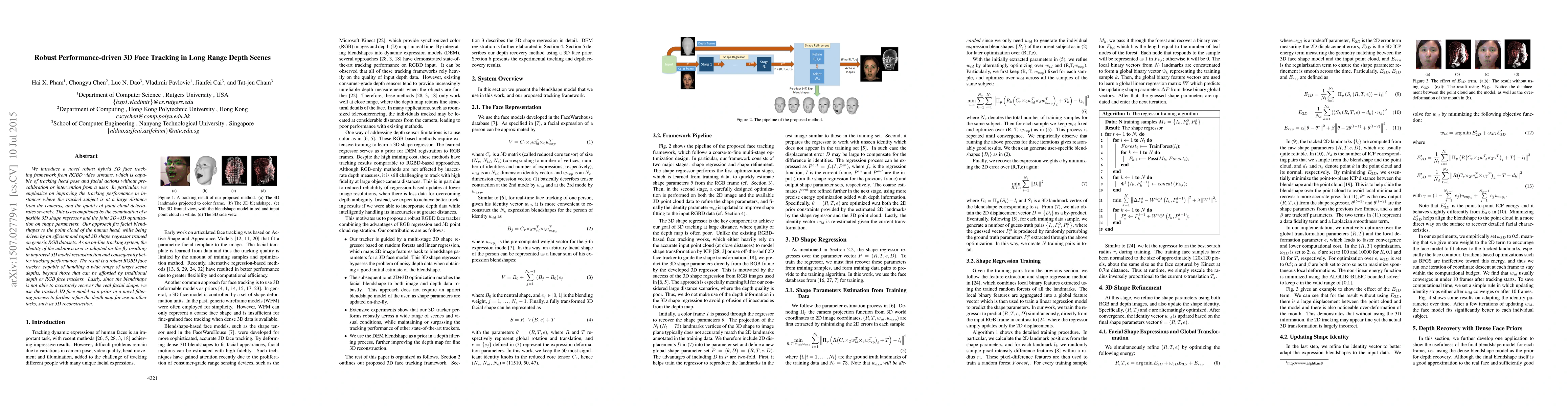 This paper presents a novel hybrid 3D face tracking framework for RGBD video streams that robustly tracks head pose and facial actions without user intervention, especially in long-range depth scenarios. It combines a flexible 3D shape regressor with joint 2D+3D optimization to enhance tracking performance.