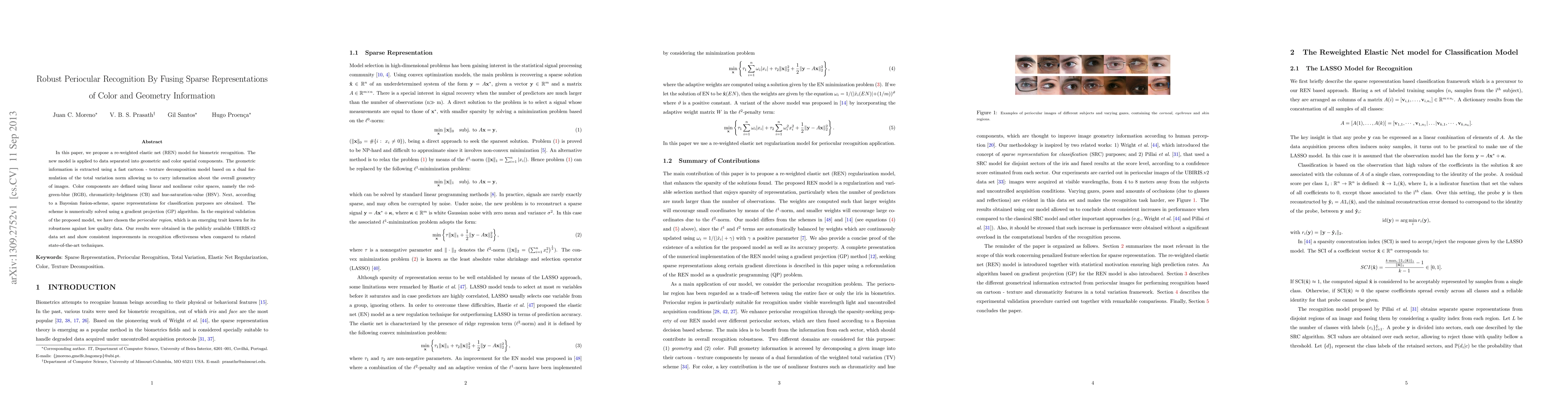 In this paper, we propose a re-weighted elastic net (REN) model for biometric recognition. The new model is applied to data separated into geometric and color spatial components. The geometric information is extracted using a fast cartoon - texture decomposition model based on a dual formulation of the total variation norm allowing us to carry information about the overall geometry of images. Color components are defined using linear and nonlinear color spaces, namely the red-green-blue (RGB), chromaticity-brightness (CB) and hue-saturation-value (HSV). Next, according to a Bayesian fusion-scheme, sparse representations for classification purposes are obtained. The scheme is numerically solved using a gradient projection (GP) algorithm. In the empirical validation of the proposed model, we have chosen the periocular region, which is an emerging trait known for its robustness against low quality data. Our results were obtained in the publicly available UBIRIS.v2 data set and show consistent improvements in recognition effectiveness when compared to related state-of-the-art techniques.