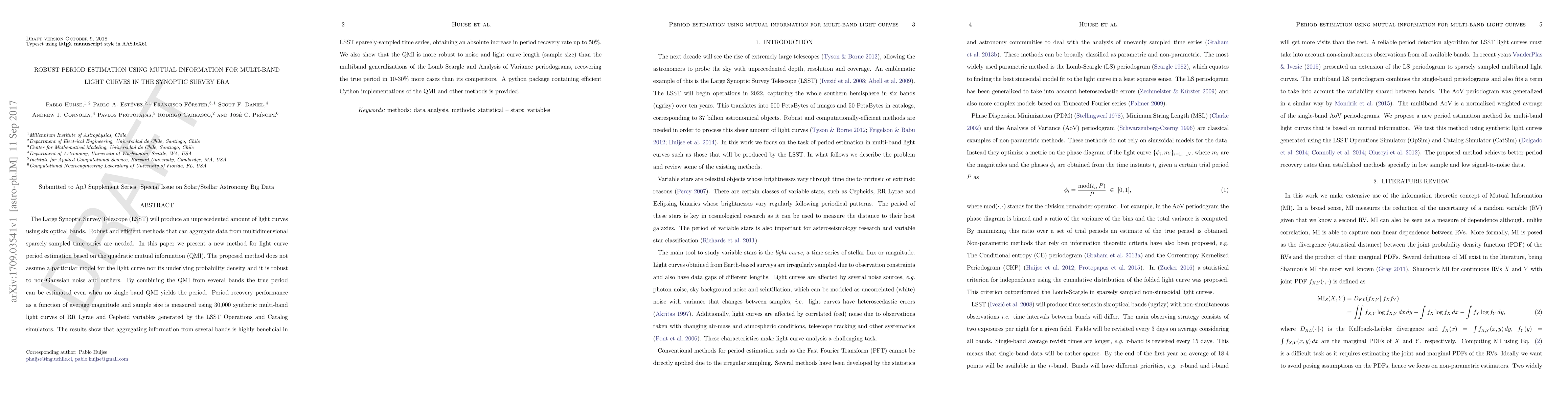 The Large Synoptic Survey Telescope (LSST) will produce an unprecedented amount of light curves using six optical bands. Robust and efficient methods that can aggregate data from multidimensional sparsely-sampled time series are needed. In this paper we present a new method for light curve period estimation based on the quadratic mutual information (QMI). The proposed method does not assume a particular model for the light curve nor its underlying probability density and it is robust to non-Gaussian noise and outliers. By combining the QMI from several bands the true period can be estimated even when no single-band QMI yields the period. Period recovery performance as a function of average magnitude and sample size is measured using 30,000 synthetic multi-band light curves of RR Lyrae and Cepheid variables generated by the LSST Operations and Catalog simulators. The results show that aggregating information from several bands is highly beneficial in LSST sparsely-sampled time series, obtaining an absolute increase in period recovery rate up to 50%. We also show that the QMI is more robust to noise and light curve length (sample size) than the multiband generalizations of the Lomb Scargle and Analysis of Variance periodograms, recovering the true period in 10-30% more cases than its competitors. A python package containing efficient Cython implementations of the QMI and other methods is provided.