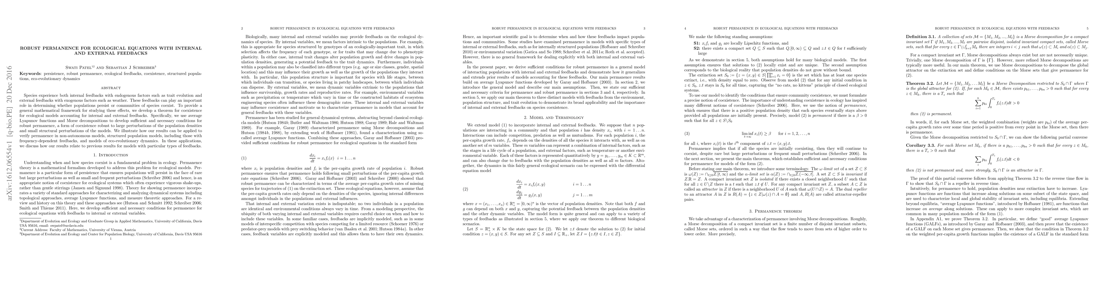 This paper develops a mathematical framework using average Lyapunov functions and Morse decompositions to establish robust permanence conditions for ecological models with internal and external feedbacks, ensuring coexistence despite perturbations. The results apply to non-autonomous models, structured populations, and eco-evolutionary dynamics.