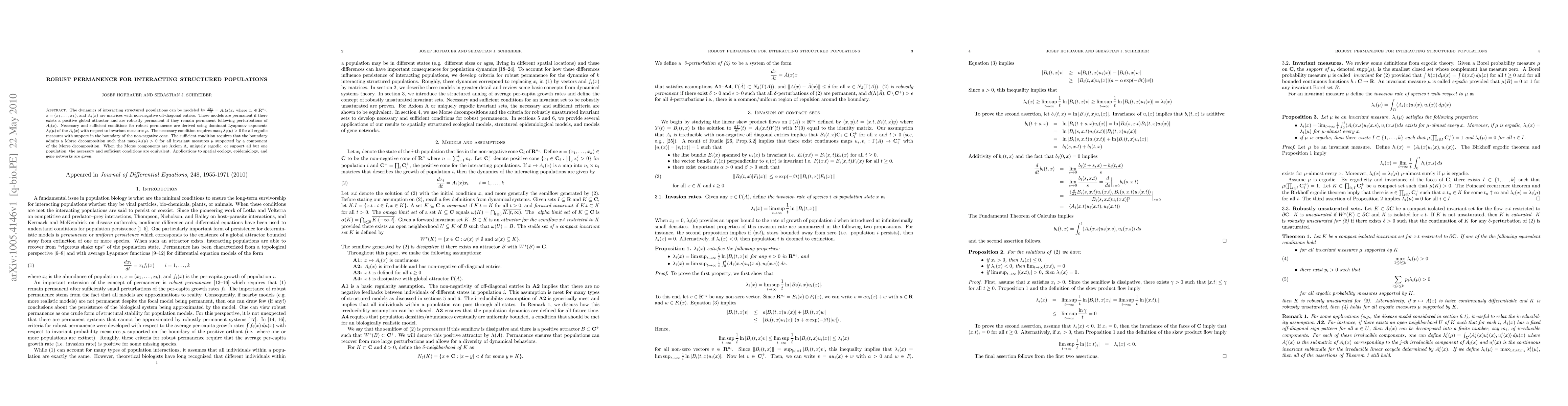 The dynamics of interacting structured populations can be modeled by $\frac{dx_i}{dt}= A_i (x)x_i$ where $x_i\in \R^{n_i}$, $x=(x_1,\dots,x_k)$, and $A_i(x)$ are matrices with non-negative off-diagonal entries. These models are permanent if there exists a positive global attractor and are robustly permanent if they remain permanent following perturbations of $A_i(x)$. Necessary and sufficient conditions for robust permanence are derived using dominant Lyapunov exponents $\lambda_i(\mu)$ of the $A_i(x)$ with respect to invariant measures $\mu$. The necessary condition requires $\max_i \lambda_i(\mu)>0$ for all ergodic measures with support in the boundary of the non-negative cone. The sufficient condition requires that the boundary admits a Morse decomposition such that $\max_i \lambda_i(\mu)>0$ for all invariant measures $\mu$ supported by a component of the Morse decomposition. When the Morse components are Axiom A, uniquely ergodic, or support all but one population, the necessary and sufficient conditions are equivalent. Applications to spatial ecology, epidemiology, and gene networks are given.