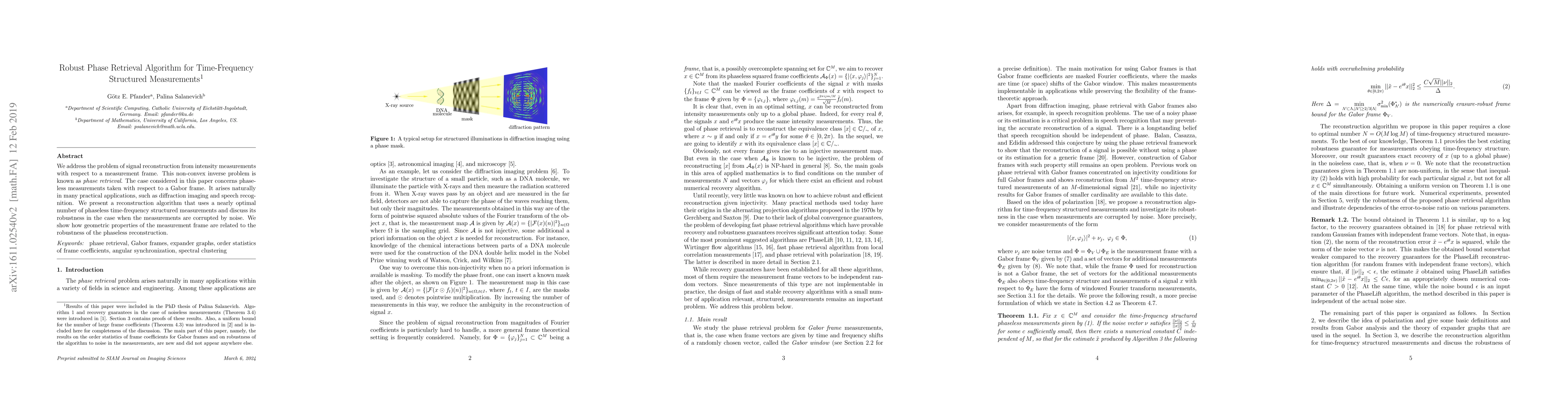 This paper proposes a robust phase retrieval algorithm for reconstructing signals from phaseless time-frequency structured measurements, specifically Gabor frames, used in applications like diffraction imaging and speech recognition. The algorithm leverages geometric properties of the measurement frame and demonstrates robustness against measurement noise.
