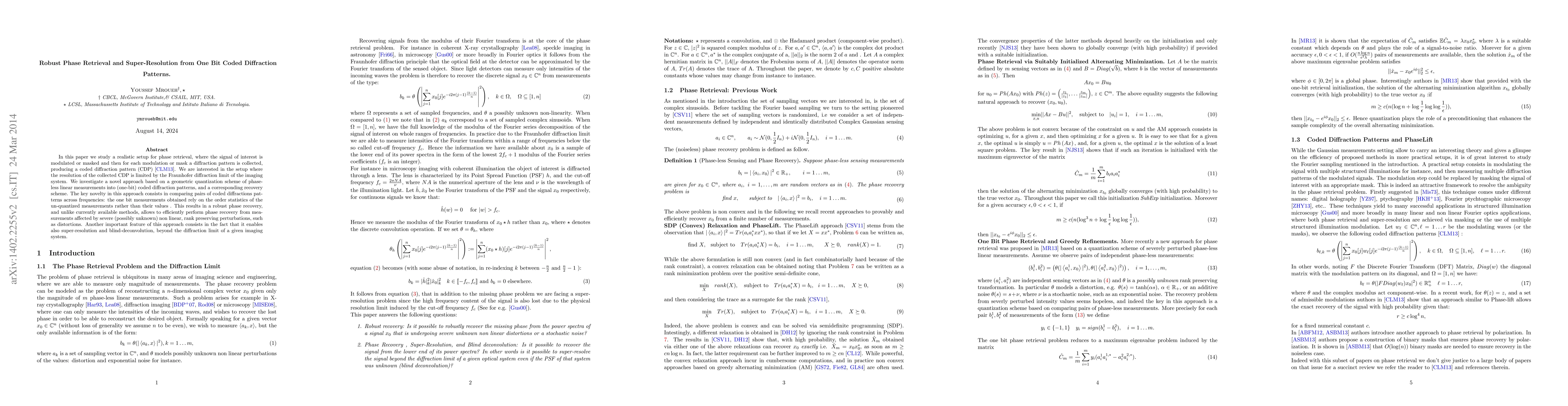 In this paper we study a realistic setup for phase retrieval, where the signal of interest is modulated or masked and then for each modulation or mask a diffraction pattern is collected, producing a coded diffraction pattern (CDP) [CLM13]. We are interested in the setup where the resolution of the collected CDP is limited by the Fraunhofer diffraction limit of the imaging system. We investigate a novel approach based on a geometric quantization scheme of phase-less linear measurements into (one-bit) coded diffraction patterns, and a corresponding recovery scheme. The key novelty in this approach consists in comparing pairs of coded diffractions patterns across frequencies: the one bit measurements obtained rely on the order statistics of the un-quantized measurements rather than their values . This results in a robust phase recovery, and unlike currently available methods, allows to efficiently perform phase recovery from measurements affected by severe (possibly unknown) non linear, rank preserving perturbations, such as distortions. Another important feature of this approach consists in the fact that it enables also super-resolution and blind-deconvolution, beyond the diffraction limit of a given imaging system.