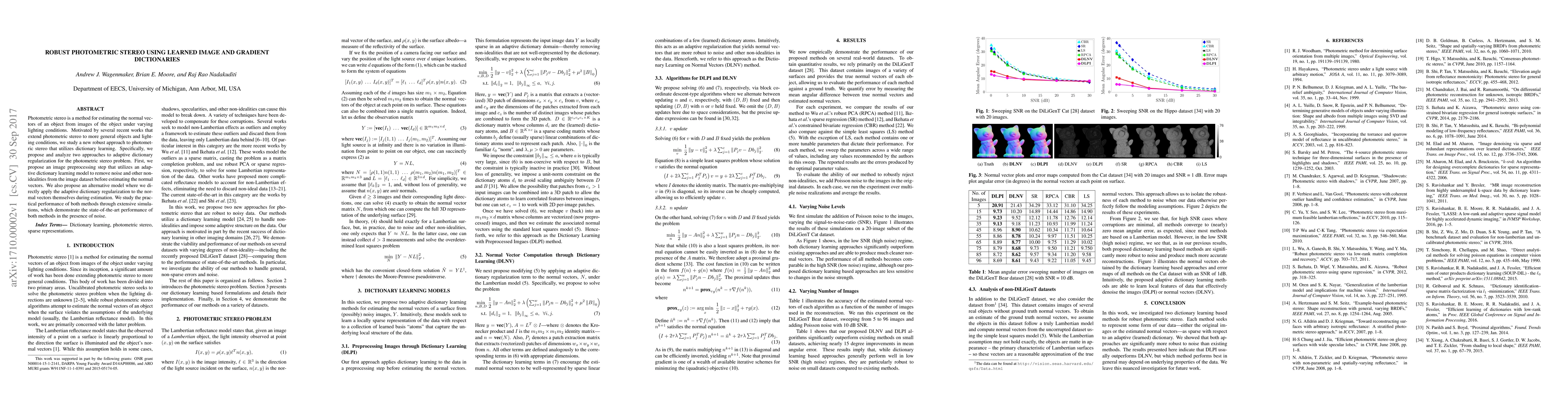 This paper proposes two robust methods for photometric stereo using adaptive dictionary learning: one preprocesses images to remove noise before normal vector estimation, and the other applies dictionary regularization directly to the normal vectors. Both methods show state-of-the-art performance in noisy conditions, as demonstrated through extensive simulations.