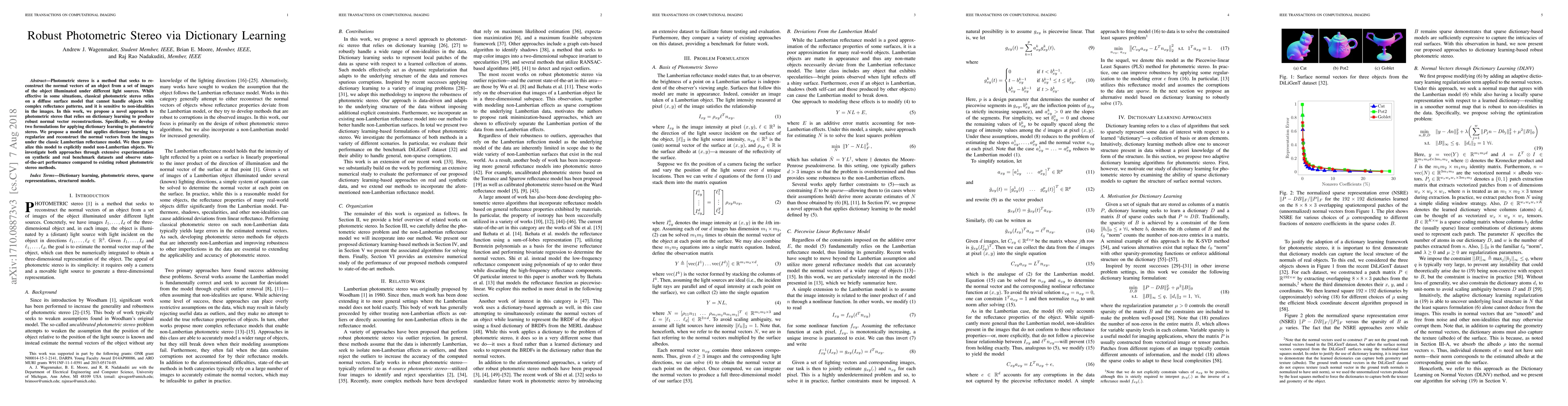 This paper proposes a novel method for robust photometric stereo using dictionary learning to reconstruct normal vectors, addressing limitations of classical methods that rely on a diffuse surface model. The authors develop two formulations to handle both Lambertian and non-Lambertian surfaces, achieving state-of-the-art performance on both synthetic and real datasets.