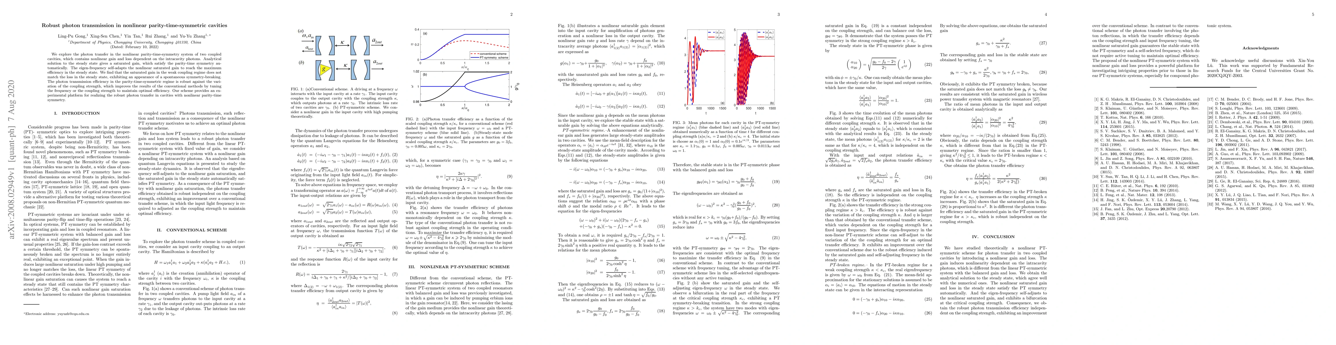 This paper investigates photon transmission in nonlinear parity-time-symmetric cavities, demonstrating robust efficiency despite variations in coupling strength. The system achieves optimal steady-state efficiency through eigen-frequency adaptation and spontaneous symmetry-breaking, outperforming conventional methods.