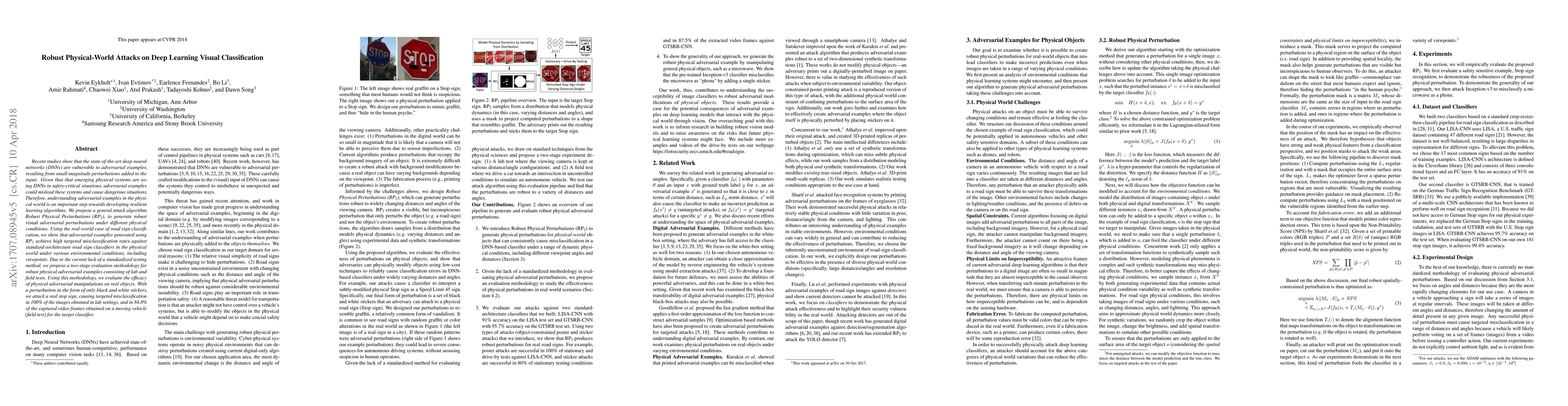 Recent studies show that the state-of-the-art deep neural networks (DNNs) are vulnerable to adversarial examples, resulting from small-magnitude perturbations added to the input. Given that that emerging physical systems are using DNNs in safety-critical situations, adversarial examples could mislead these systems and cause dangerous situations.Therefore, understanding adversarial examples in the physical world is an important step towards developing resilient learning algorithms. We propose a general attack algorithm,Robust Physical Perturbations (RP2), to generate robust visual adversarial perturbations under different physical conditions. Using the real-world case of road sign classification, we show that adversarial examples generated using RP2 achieve high targeted misclassification rates against standard-architecture road sign classifiers in the physical world under various environmental conditions, including viewpoints. Due to the current lack of a standardized testing method, we propose a two-stage evaluation methodology for robust physical adversarial examples consisting of lab and field tests. Using this methodology, we evaluate the efficacy of physical adversarial manipulations on real objects. Witha perturbation in the form of only black and white stickers,we attack a real stop sign, causing targeted misclassification in 100% of the images obtained in lab settings, and in 84.8%of the captured video frames obtained on a moving vehicle(field test) for the target classifier.