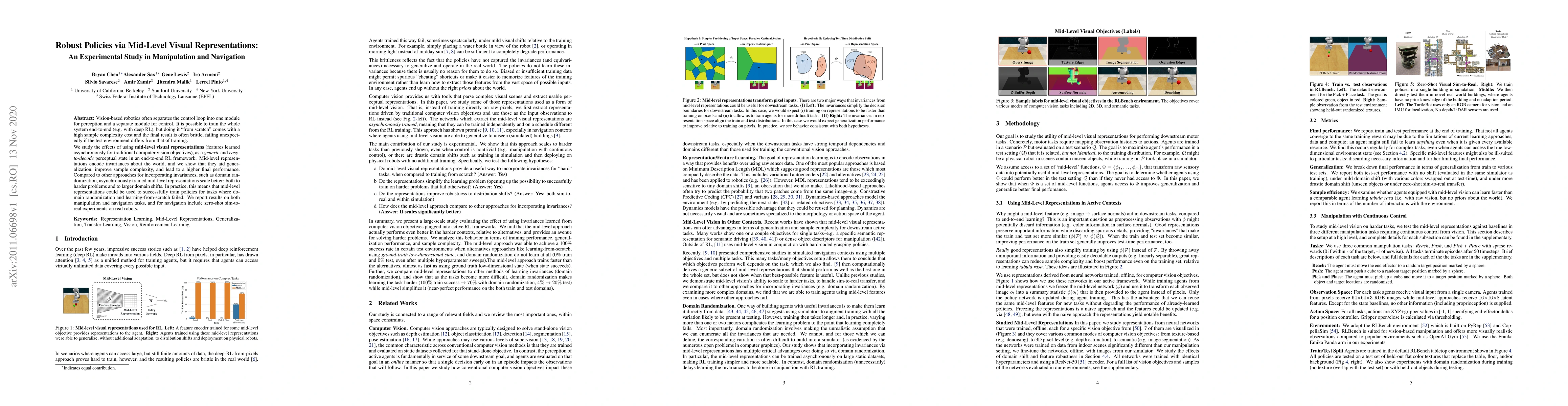 Vision-based robotics often separates the control loop into one module for perception and a separate module for control. It is possible to train the whole system end-to-end (e.g. with deep RL), but doing it "from scratch" comes with a high sample complexity cost and the final result is often brittle, failing unexpectedly if the test environment differs from that of training. We study the effects of using mid-level visual representations (features learned asynchronously for traditional computer vision objectives), as a generic and easy-to-decode perceptual state in an end-to-end RL framework. Mid-level representations encode invariances about the world, and we show that they aid generalization, improve sample complexity, and lead to a higher final performance. Compared to other approaches for incorporating invariances, such as domain randomization, asynchronously trained mid-level representations scale better: both to harder problems and to larger domain shifts. In practice, this means that mid-level representations could be used to successfully train policies for tasks where domain randomization and learning-from-scratch failed. We report results on both manipulation and navigation tasks, and for navigation include zero-shot sim-to-real experiments on real robots.