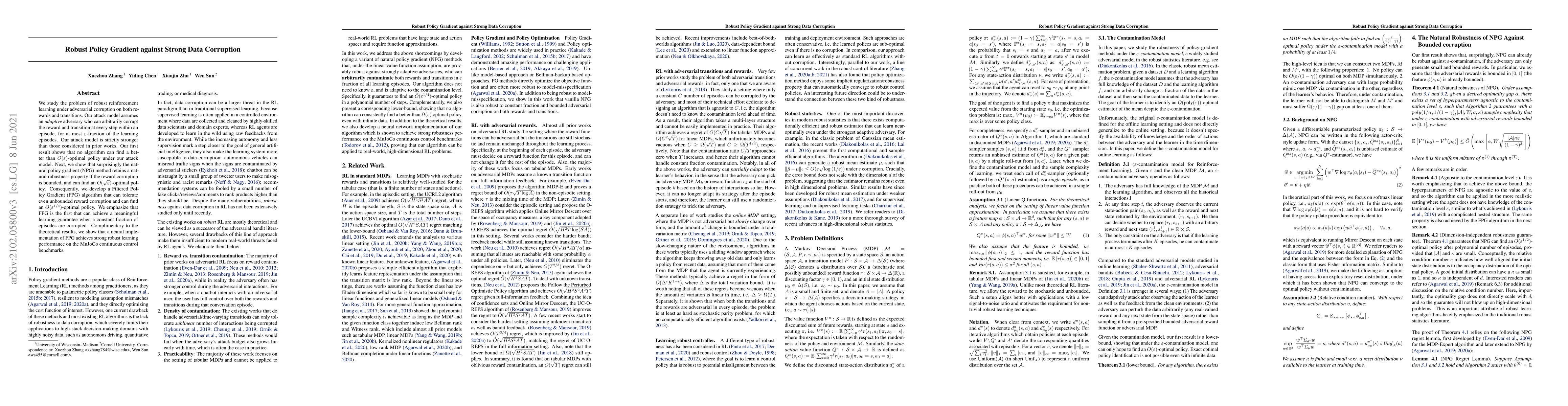 We study the problem of robust reinforcement learning under adversarial corruption on both rewards and transitions. Our attack model assumes an \textit{adaptive} adversary who can arbitrarily corrupt the reward and transition at every step within an episode, for at most $\epsilon$-fraction of the learning episodes. Our attack model is strictly stronger than those considered in prior works. Our first result shows that no algorithm can find a better than $O(\epsilon)$-optimal policy under our attack model. Next, we show that surprisingly the natural policy gradient (NPG) method retains a natural robustness property if the reward corruption is bounded, and can find an $O(\sqrt{\epsilon})$-optimal policy. Consequently, we develop a Filtered Policy Gradient (FPG) algorithm that can tolerate even unbounded reward corruption and can find an $O(\epsilon^{1/4})$-optimal policy. We emphasize that FPG is the first that can achieve a meaningful learning guarantee when a constant fraction of episodes are corrupted. Complimentary to the theoretical results, we show that a neural implementation of FPG achieves strong robust learning performance on the MuJoCo continuous control benchmarks.