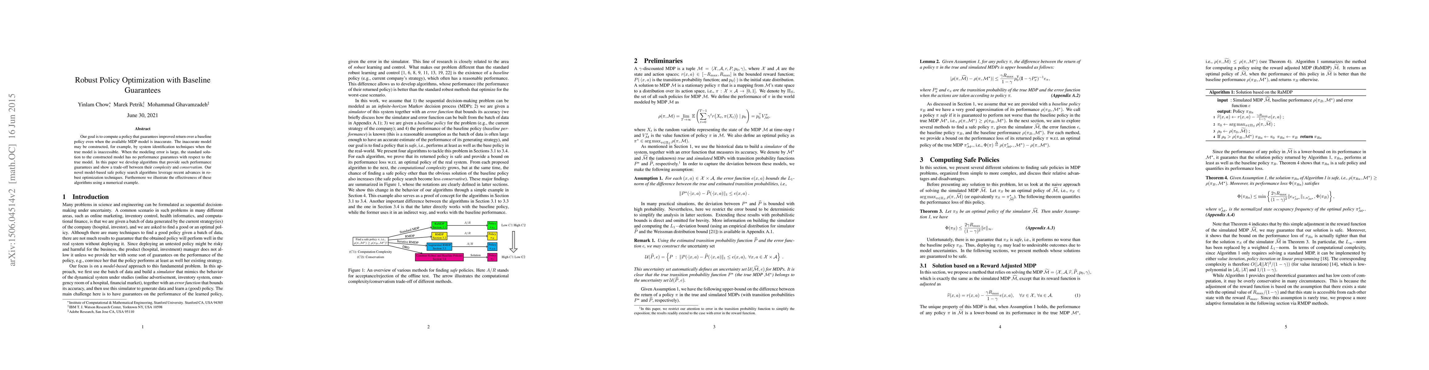 This paper develops robust optimization algorithms to find policies that guarantee improved returns over baseline policies, even when the underlying Markov Decision Process model is inaccurate. The proposed methods provide performance guarantees despite modeling errors and demonstrate a trade-off between algorithm complexity and conservatism through a numerical example.