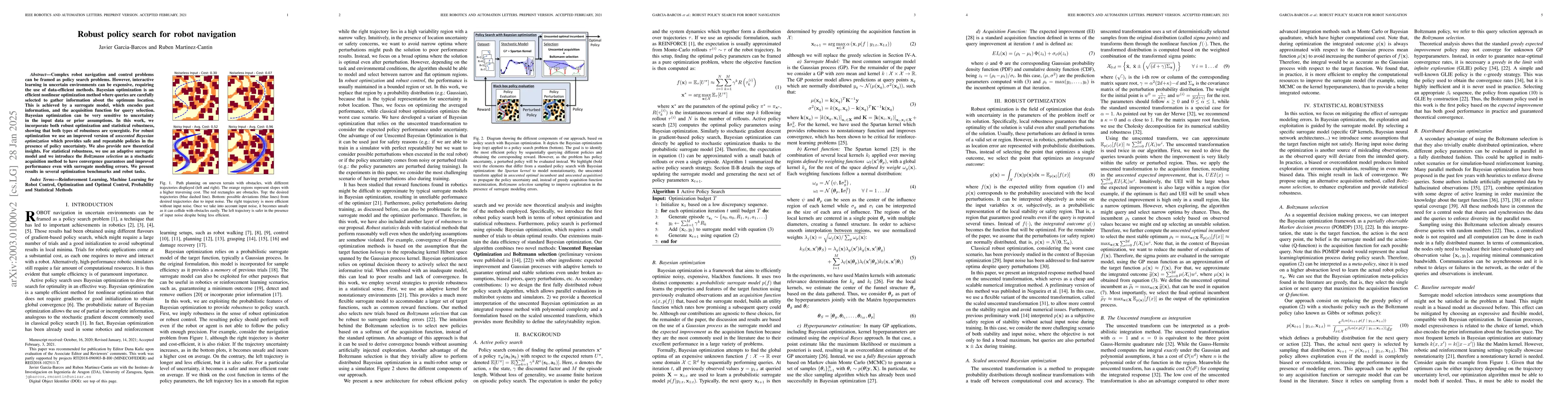 This paper proposes a robust policy search method for robot navigation using Bayesian optimization, enhanced with unscented transformations for noise handling and stochastic meta-policies to improve exploration and adapt to mismodeling errors. The combined approach outperforms individual methods in various benchmarks and real-world robot tasks.