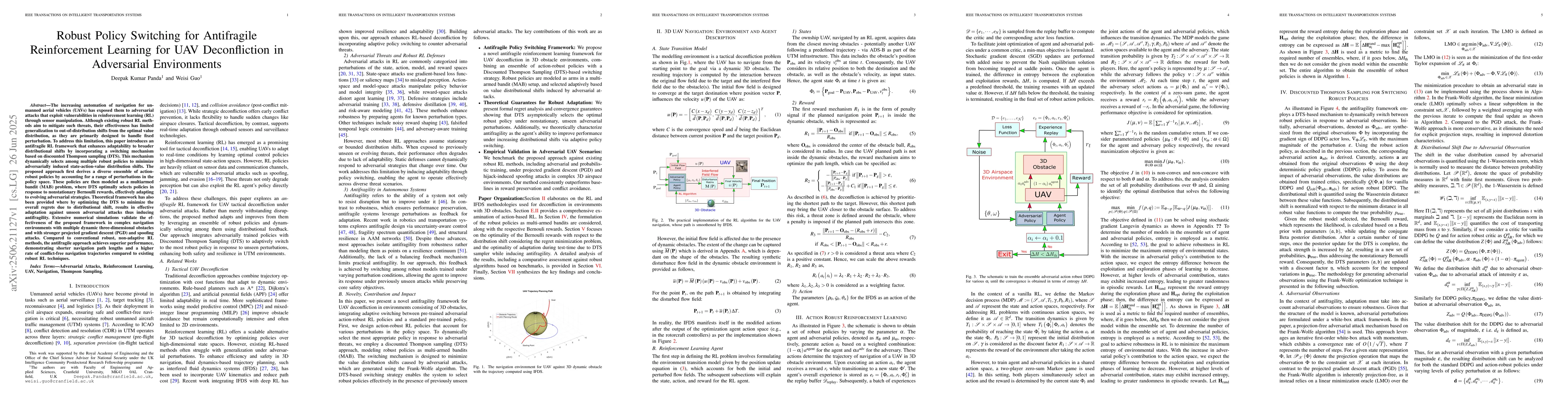 The paper introduces an antifragile RL framework that employs a switching mechanism based on discounted Thompson sampling (DTS) to dynamically select among multiple robust policies in UAV navigation environments under adversarial attacks.