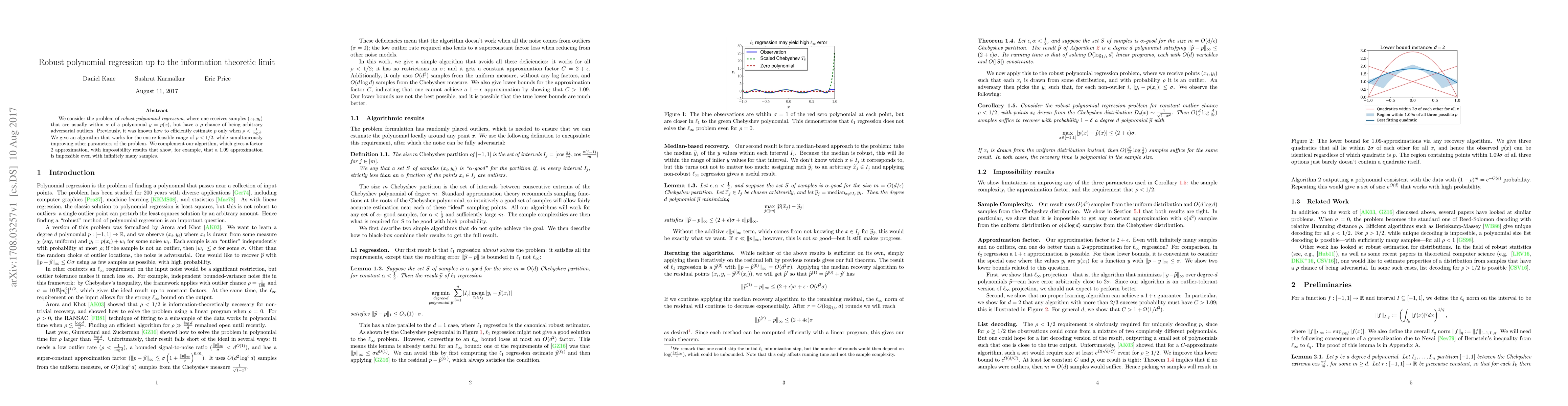 We consider the problem of robust polynomial regression, where one receives samples $(x_i, y_i)$ that are usually within $\sigma$ of a polynomial $y = p(x)$, but have a $\rho$ chance of being arbitrary adversarial outliers. Previously, it was known how to efficiently estimate $p$ only when $\rho < \frac{1}{\log d}$. We give an algorithm that works for the entire feasible range of $\rho < 1/2$, while simultaneously improving other parameters of the problem. We complement our algorithm, which gives a factor 2 approximation, with impossibility results that show, for example, that a $1.09$ approximation is impossible even with infinitely many samples.