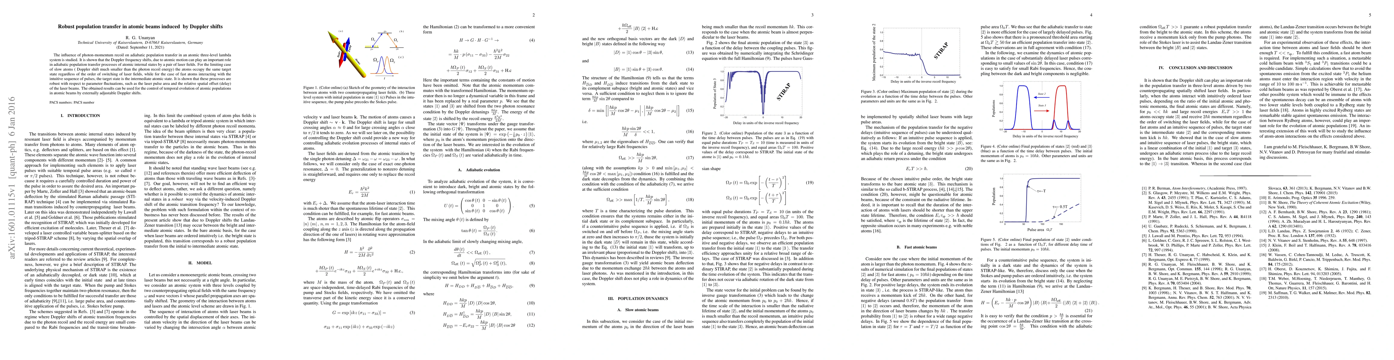 The influence of photon-momentum recoil on adiabatic population transfer in an atomic three-level lambda system is studied. It is shown that the Doppler frequency shifts, due to atomic motion can play an important role in adiabatic population transfer processes of atomic internal states by a pair of laser fields. For the limiting case of slow atoms ( Doppler shift much smaller than the photon recoil energy) the atoms occupy the same target state regardless of the order of switching of laser fields, while for the case of fast atoms interacting with the intuitive sequence of pulses, the target state is the intermediate atomic state. It is shown that these processes are robust with respect to parameter fluctuations, such as the laser pulse area and the relative spatial offset (delay) of the laser beams. The obtained results can be used for the control of temporal evolution of atomic populations in atomic beams by externally adjustable Doppler shifts.