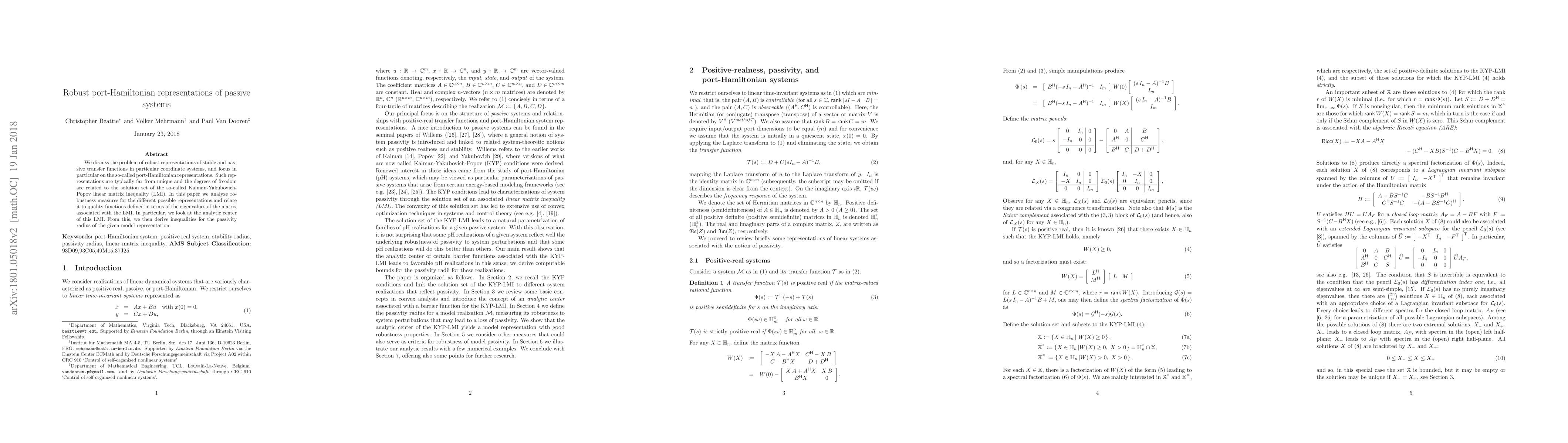 We discuss the problem of robust representations of stable and passive transfer functions in particular coordinate systems, and focus in particular on the so-called port-Hamiltonian representations. Such representations are typically far from unique and the degrees of freedom are related to the solution set of the so-called Kalman-Yakubovich-Popov linear matrix inequality (LMI). In this paper we analyze robustness measures for the different possible representations and relate it to quality functions defined in terms of the eigenvalues of the matrix associated with the LMI. In particular, we look at the analytic center of this LMI. From this, we then derive inequalities for the passivity radius of the given model representation.