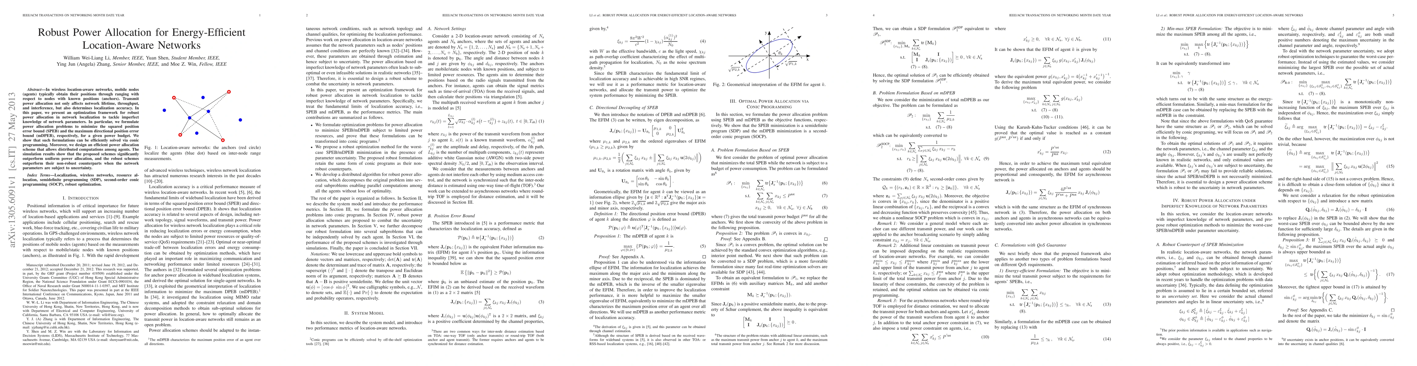 This paper presents an optimization framework for robust power allocation in location-aware networks to minimize position error bounds while considering uncertainty in network parameters. It outperforms uniform power allocation and its non-robust counterparts in simulation results.
