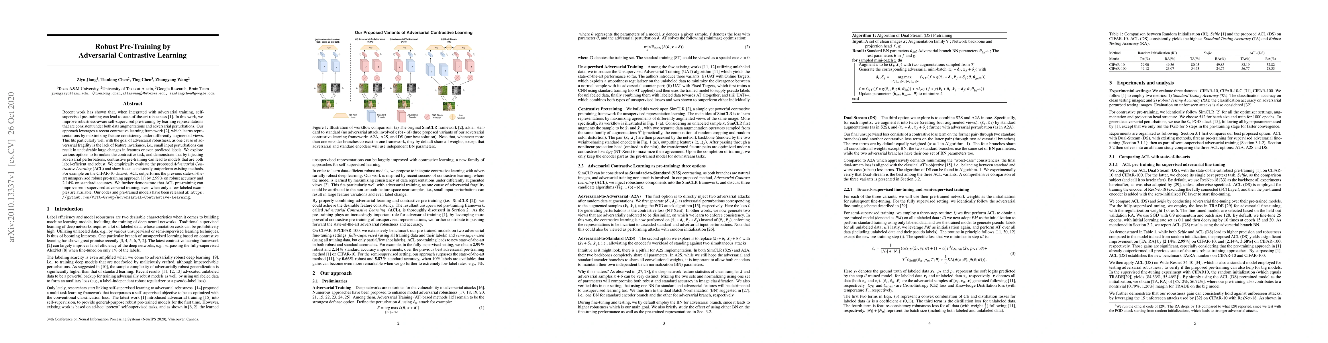 Recent work has shown that, when integrated with adversarial training, self-supervised pre-training can lead to state-of-the-art robustness In this work, we improve robustness-aware self-supervised pre-training by learning representations that are consistent under both data augmentations and adversarial perturbations. Our approach leverages a recent contrastive learning framework, which learns representations by maximizing feature consistency under differently augmented views. This fits particularly well with the goal of adversarial robustness, as one cause of adversarial fragility is the lack of feature invariance, i.e., small input perturbations can result in undesirable large changes in features or even predicted labels. We explore various options to formulate the contrastive task, and demonstrate that by injecting adversarial perturbations, contrastive pre-training can lead to models that are both label-efficient and robust. We empirically evaluate the proposed Adversarial Contrastive Learning (ACL) and show it can consistently outperform existing methods. For example on the CIFAR-10 dataset, ACL outperforms the previous state-of-the-art unsupervised robust pre-training approach by 2.99% on robust accuracy and 2.14% on standard accuracy. We further demonstrate that ACL pre-training can improve semi-supervised adversarial training, even when only a few labeled examples are available. Our codes and pre-trained models have been released at: https://github.com/VITA-Group/Adversarial-Contrastive-Learning.
