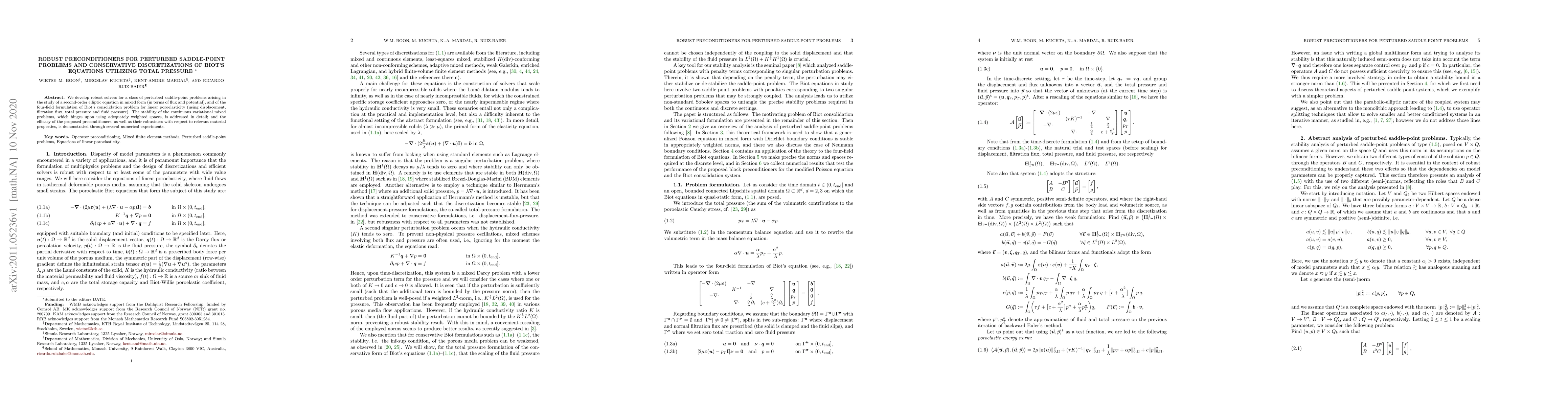 We develop robust solvers for a class of perturbed saddle-point problems arising in the study of a second-order elliptic equation in mixed form (in terms of flux and potential), and of the four-field formulation of Biot's consolidation problem for linear poroelasticity (using displacement, filtration flux, total pressure and fluid pressure). The stability of the continuous variational mixed problems, which hinges upon using adequately weighted spaces, is addressed in detail; and the efficacy of the proposed preconditioners, as well as their robustness with respect to relevant material properties, is demonstrated through several numerical experiments.
