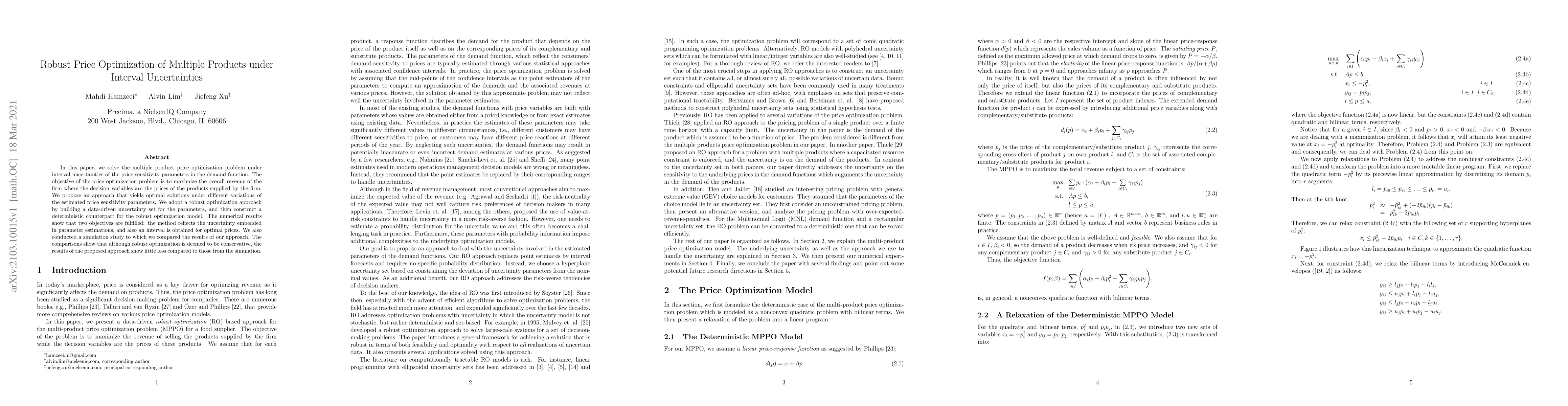 This paper proposes a robust optimization method for price optimization of multiple products under interval uncertainties in price sensitivity parameters. The approach constructs a deterministic model to maximize firm revenue, reflecting parameter estimation uncertainties and providing an interval for optimal prices, with minimal loss compared to simulation results.