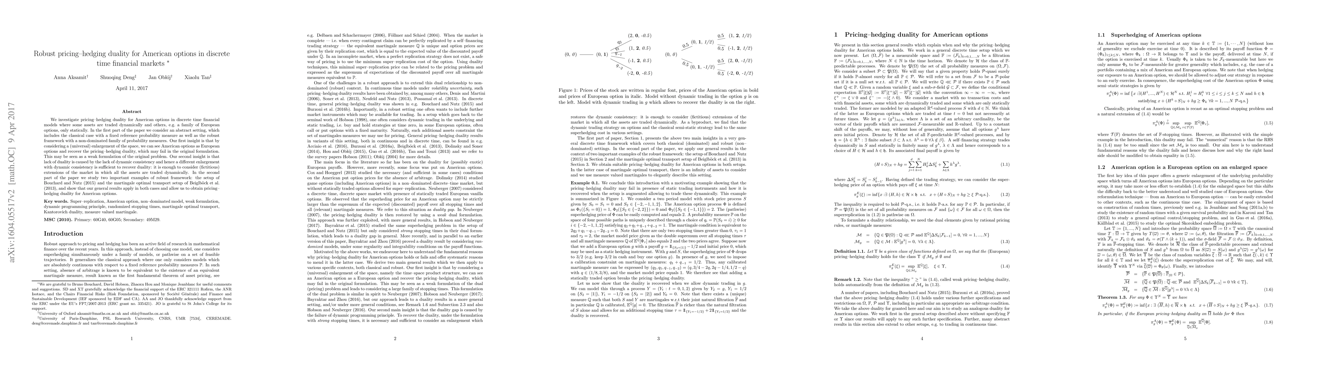 We investigate pricing-hedging duality for American options in discrete time financial models where some assets are traded dynamically and others, e.g. a family of European options, only statically. In the first part of the paper we consider an abstract setting, which includes the classical case with a fixed reference probability measure as well as the robust framework with a non-dominated family of probability measures. Our first insight is that by considering a (universal) enlargement of the space, we can see American options as European options and recover the pricing-hedging duality, which may fail in the original formulation. This may be seen as a weak formulation of the original problem. Our second insight is that lack of duality is caused by the lack of dynamic consistency and hence a different enlargement with dynamic consistency is sufficient to recover duality: it is enough to consider (fictitious) extensions of the market in which all the assets are traded dynamically. In the second part of the paper we study two important examples of robust framework: the setup of Bouchard and Nutz (2015) and the martingale optimal transport setup of Beiglb\"ock et al. (2013), and show that our general results apply in both cases and allow us to obtain pricing-hedging duality for American options.
