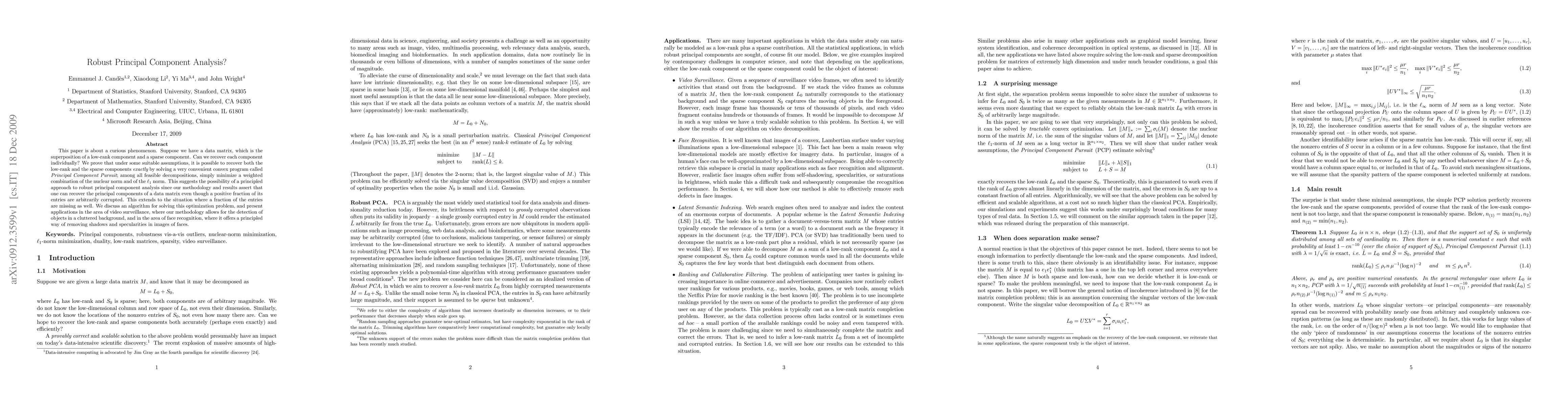 This paper proposes a convex optimization method called Principal Component Pursuit to recover low-rank and sparse components from a data matrix, demonstrating its robustness against corrupted or missing entries. Applications include object detection in video surveillance and improved face recognition by removing shadows and specularities.