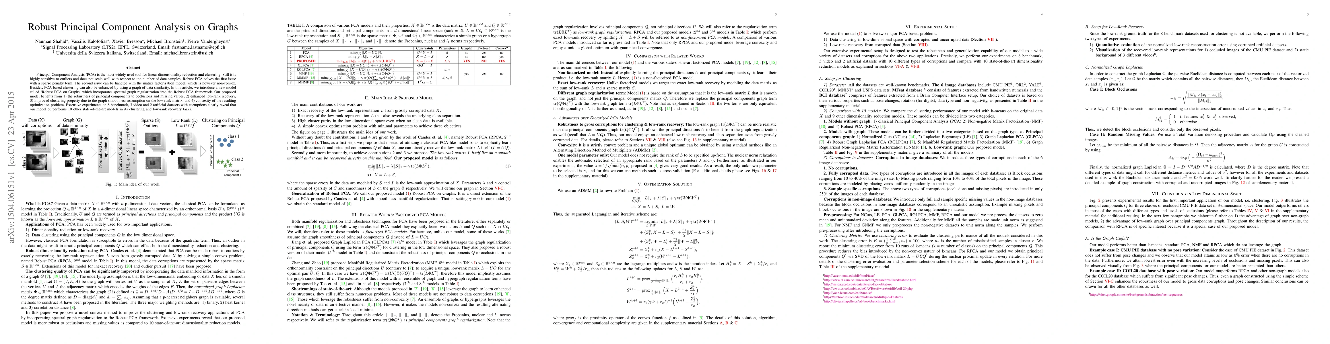 This paper proposes a "Robust PCA on Graphs" model that integrates spectral graph regularization into Robust PCA to enhance robustness, low-rank recovery, and clustering. The model demonstrates superior performance over other state-of-the-art methods in experiments across various datasets.