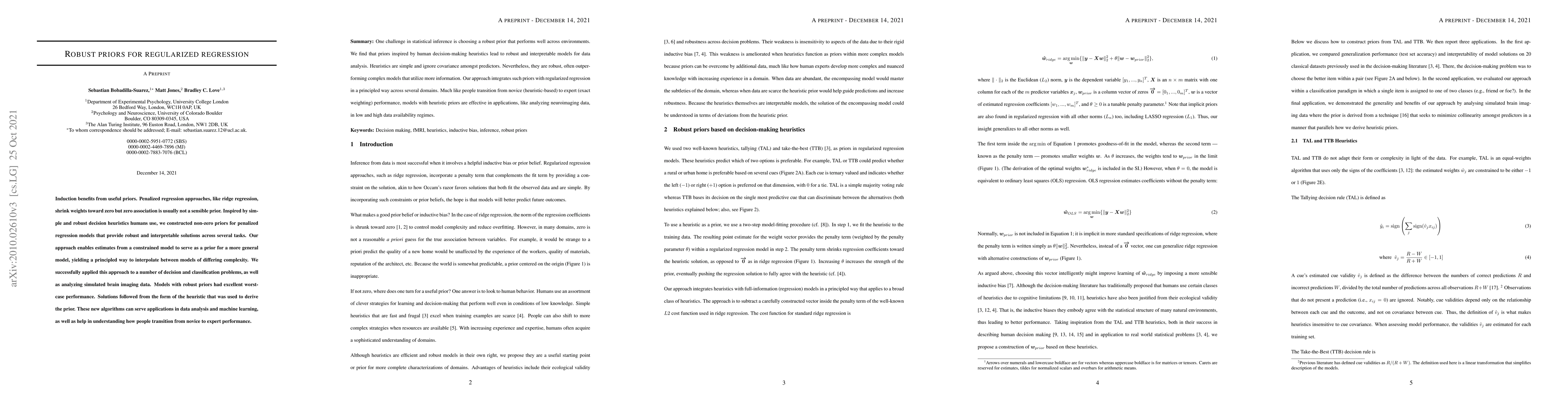 This research introduces robust priors for penalized regression models, inspired by human decision-making heuristics. These priors ensure non-zero associations, leading to interpretable and robust solutions across diverse tasks. The method allows for interpolation between model complexities and demonstrates excellent performance in various applications, including brain imaging data analysis and machine learning problems.