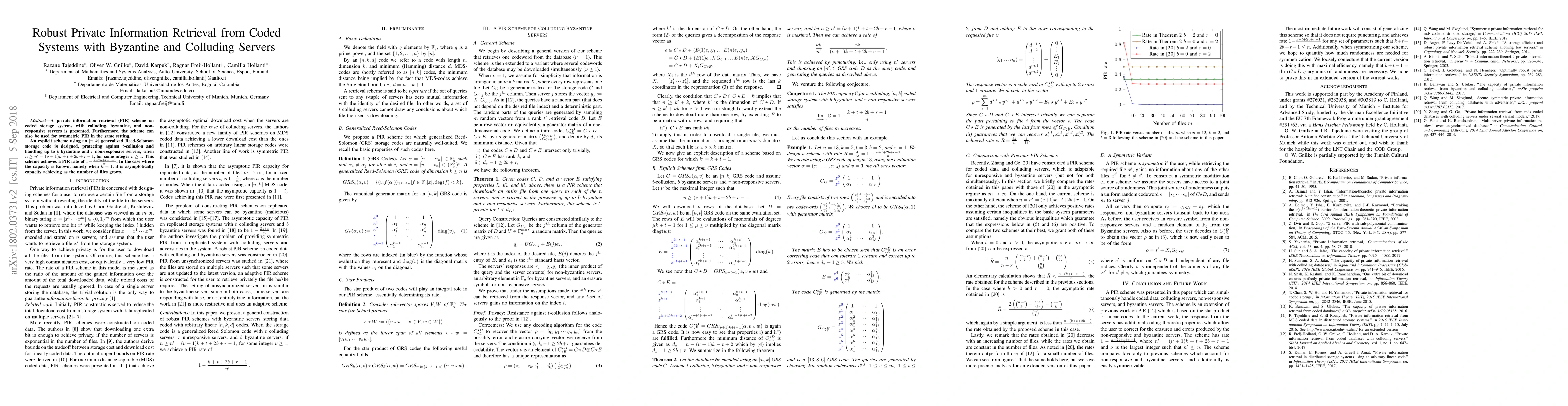 A private information retrieval (PIR) scheme on coded storage systems with colluding, byzantine, and non-responsive servers is presented. Furthermore, the scheme can also be used for symmetric PIR in the same setting. An explicit scheme using an $[n,k]$ generalized Reed-Solomon storage code is designed, protecting against $t$-collusion and handling up to $b$ byzantine and $r$ non-responsive servers, when $n\geq n'= (\nu +1) k+t+2b+r-1$, for some integer $\nu \geq 1$. This scheme achieves a PIR rate of $1-\frac{k+2b+t+r-1}{n'}$. In the case where the capacity is known, namely when $k=1$, it is asymptotically capacity achieving as the number of files grows.