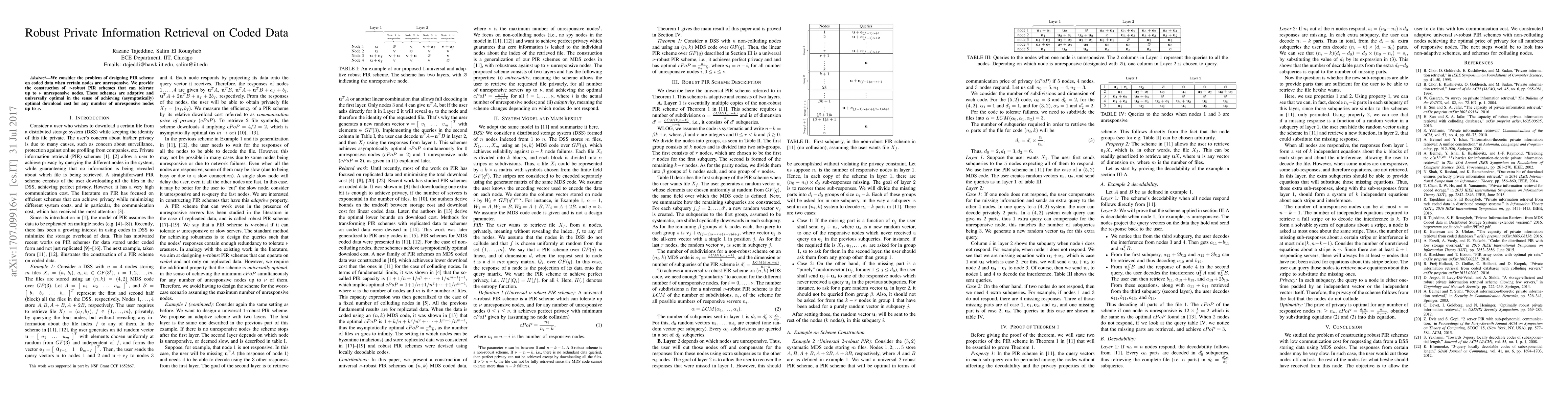 We consider the problem of designing PIR scheme on coded data when certain nodes are unresponsive. We provide the construction of $\nu$-robust PIR schemes that can tolerate up to $\nu$ unresponsive nodes. These schemes are adaptive and universally optimal in the sense of achieving (asymptotically) optimal download cost for any number of unresponsive nodes up to $\nu$.
