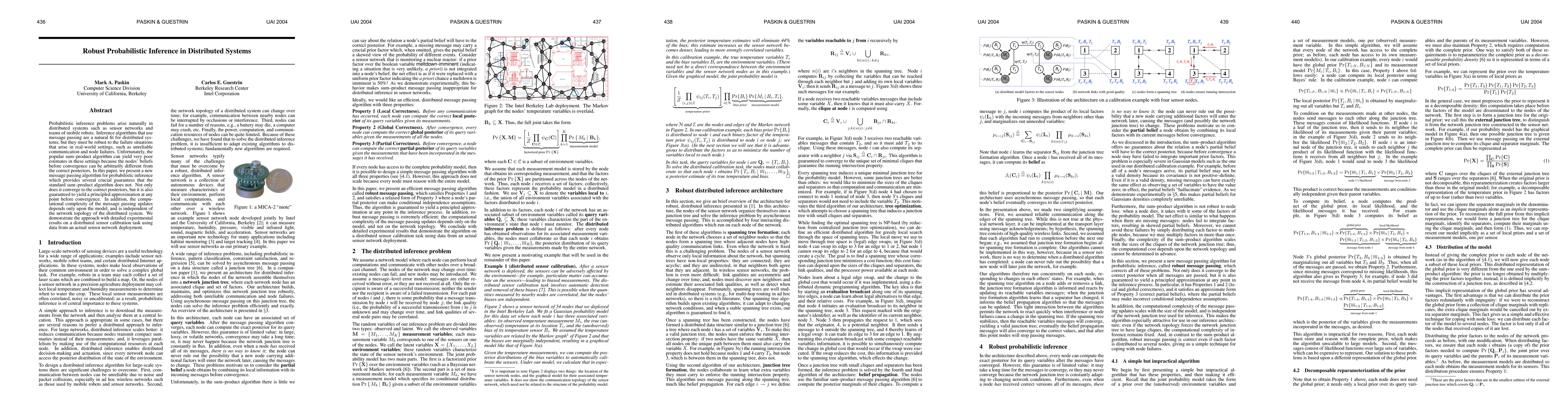Probabilistic inference problems arise naturally in distributed systems such as sensor networks and teams of mobile robots. Inference algorithms that use message passing are a natural fit for distributed systems, but they must be robust to the failure situations that arise in real-world settings, such as unreliable communication and node failures. Unfortunately, the popular sum-product algorithm can yield very poor estimates in these settings because the nodes' beliefs before convergence can be arbitrarily different from the correct posteriors. In this paper, we present a new message passing algorithm for probabilistic inference which provides several crucial guarantees that the standard sum-product algorithm does not. Not only does it converge to the correct posteriors, but it is also guaranteed to yield a principled approximation at any point before convergence. In addition, the computational complexity of the message passing updates depends only upon the model, and is dependent of the network topology of the distributed system. We demonstrate the approach with detailed experimental results on a distributed sensor calibration task using data from an actual sensor network deployment.