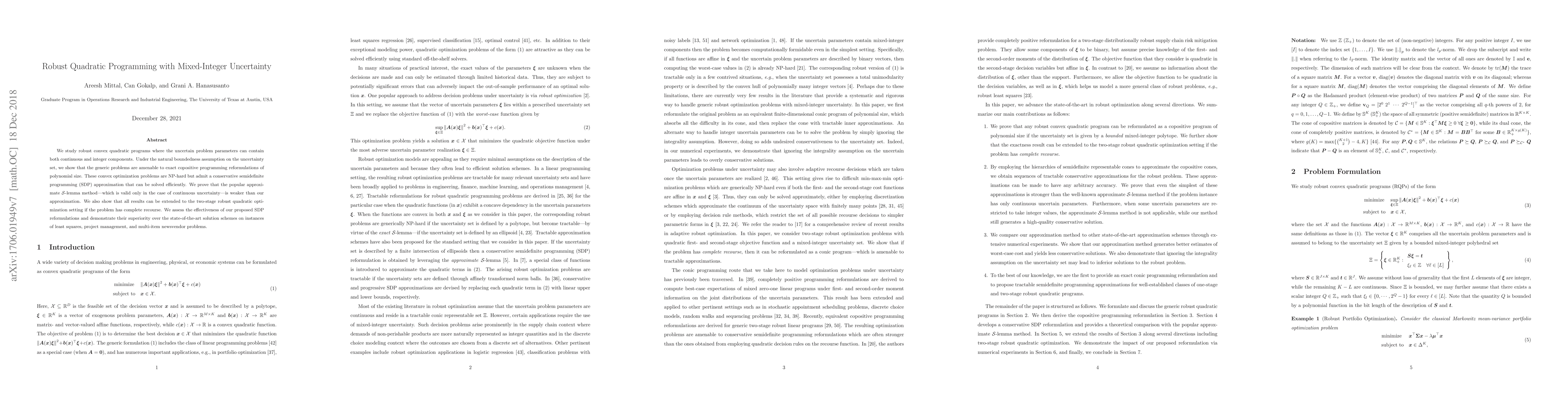 We study robust convex quadratic programs where the uncertain problem parameters can contain both continuous and integer components. Under the natural boundedness assumption on the uncertainty set, we show that the generic problems are amenable to exact copositive programming reformulations of polynomial size. These convex optimization problems are NP-hard but admit a conservative semidefinite programming (SDP) approximation that can be solved efficiently. We prove that the popular approximate S-lemma method --- which is valid only in the case of continuous uncertainty --- is weaker than our approximation. We also show that all results can be extended to the two-stage robust quadratic optimization setting if the problem has complete recourse. We assess the effectiveness of our proposed SDP reformulations and demonstrate their superiority over the state-of-the-art solution schemes on instances of least squares, project management, and multi-item newsvendor problems.