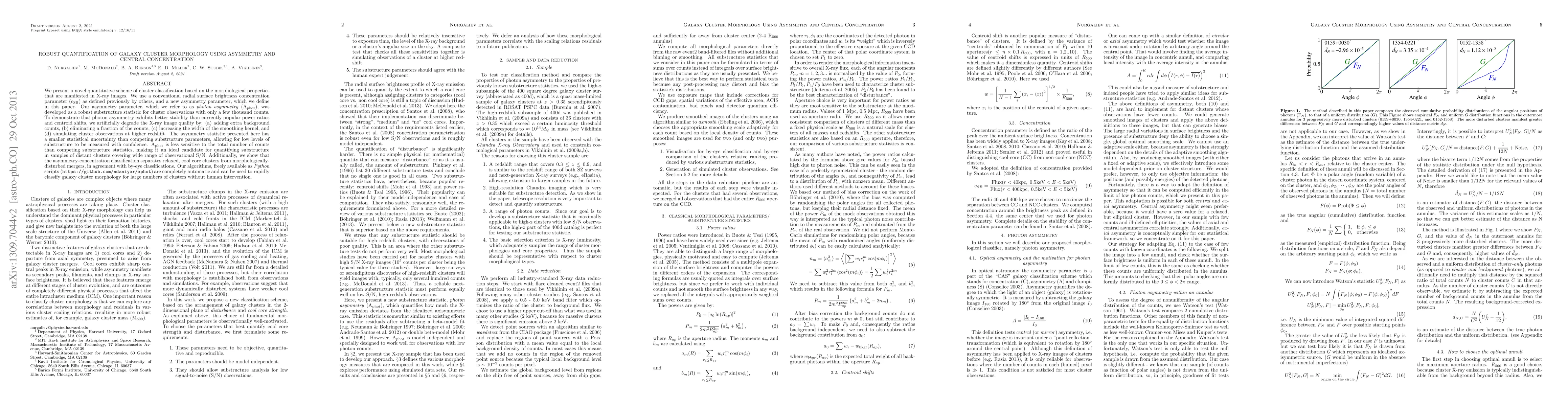 We present a novel quantitative scheme of cluster classification based on the morphological properties that are manifested in X-ray images. We use a conventional radial surface brightness concentration parameter (c_{SB}) as defined previously by others, and a new asymmetry parameter, which we define in this paper. Our asymmetry parameter, which we refer to as photon asymmetry ($A_{phot}), was developed as a robust substructure statistic for cluster observations with only a few thousand counts. To demonstrate that photon asymmetry exhibits better stability than currently popular power ratios and centroid shifts, we artificially degrade the X-ray image quality by: (a) adding extra background counts, (b) eliminating a fraction of the counts, (c) increasing the width of the smoothing kernel, and (d) simulating cluster observations at higher redshift. The asymmetry statistic presented here has a smaller statistical uncertainty than competing substructure parameters, allowing for low levels of substructure to be measured with confidence. A_{phot} is less sensitive to the total number of counts than competing substructure statistics, making it an ideal candidate for quantifying substructure in samples of distant clusters covering wide range of observational S/N. Additionally, we show that the asymmetry-concentration classification separates relaxed, cool core clusters from morphologically-disturbed mergers, in agreement with by-eye classifications. Our algorithms, freely available as Python scripts (https://github.com/ndaniyar/aphot) are completely automatic and can be used to rapidly classify galaxy cluster morphology for large numbers of clusters without human intervention.