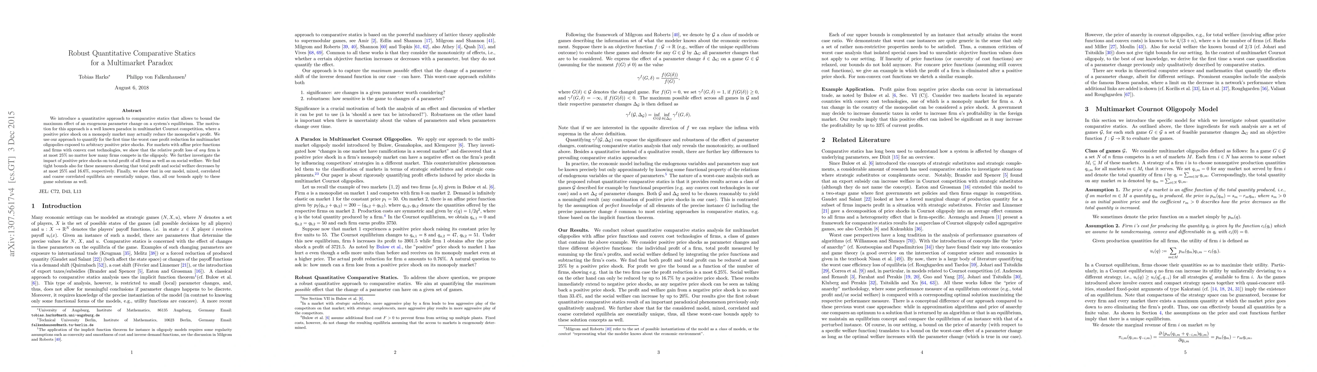 We introduce a quantitative approach to comparative statics that allows to bound the maximum effect of an exogenous parameter change on a system's equilibrium. The motivation for this approach is a well known paradox in multimarket Cournot competition, where a positive price shock on a monopoly market may actually reduce the monopolist's profit. We use our approach to quantify for the first time the worst case profit reduction for multimarket oligopolies exposed to arbitrary positive price shocks. For markets with affine price functions and firms with convex cost technologies, we show that the relative profit loss of any firm is at most 25% no matter how many firms compete in the oligopoly. We further investigate the impact of positive price shocks on total profit of all firms as well as on social welfare. We find tight bounds also for these measures showing that total profit and social welfare decreases by at most 25% and 16.6%, respectively. Finally, we show that in our model, mixed, correlated and coarse correlated equilibria are essentially unique, thus, all our bounds apply to these game solutions as well.